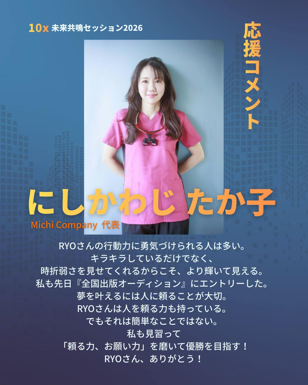 2026/03/14 08:5710x未来共鳴セッション応援メッセージいただきました!にしかわじ たか子さま@takako_nishikawaji --応援メッセージ--RYOさんの行動力に勇気づけられる人は多い。キラキラしているだけでなく、時折弱さを見せてくれるからこそ、より輝いて見える。私も先日『全国出版オーディション』にエントリーした。夢を叶えるには人に頼ることが大切。RYOさんは人を頼る力も持っている。でもそれは簡単なことではない。私も見習って「頼る力、お願い力」を磨いて優勝を目指す! RYOさん、ありがとう!--終了--たか子さんとは大嶋啓介さんのセミナーで一緒になりました。ご自身も本、出版を目指して奮闘中です!一緒に夢を叶えていきましょう!私もたか子さんからエネルギーと刺激を受けています!感謝無限大◎共鳴整体師×人生を共鳴するラッパー@ryokawabata109 主催するイベント⬇10x未来共鳴セッション2026日時2026年5月16日(土)開場:12:30〜(予定)開演:13:00〜16:00会場銀座 THE BAGUS PLACE東京都中央区銀座2-4-6 銀座Velvia館 B1F(東京都中央区) イベント内容セミナー×ライブ×体験型イベント。「10x思考」をベースに、音楽・対話・ライブ・参加体験を通じて人生の未来を共鳴させるプログラム。 主な出演者(予定) 山﨑拓巳 さん(作家/夢実現プロデューサー) 名郷根修 さん(10x著者/株式会社ハイパフォーマンス代表取締役) 川畑亮 (共鳴整体師/ラッパー/変容プロデューサー) 懇親会(希望者のみ)イベント後に希望者向けの懇親会(交流会)あり(別途参加可) 定員・料金8800円定員:約120名3月2日よりクラウドファンディング開始!詳細は概要をチェックしてください!https://camp-fire.jp/projects/904628/view#クラファン#クラファン挑戦中#クラウドファンディング もっと見る
