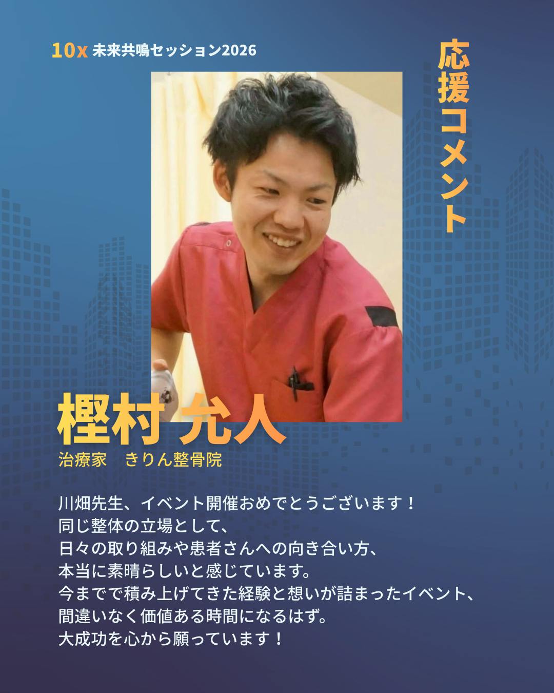 2026/03/16 10:4010X 未来共鳴セッション2026応援コメントいただきました!樫村允人さん @masato.kashi 治療家 きりん整骨院川畑先生、イベント開催おめでとうございます!同じ整体の立場として、日々の取り組みや患者さんへの向き合い方、本当に素晴らしいと感じています。今までで積み上げてきた経験と想いが詰まったイベント、間違いなく価値ある時間になるはず。大成功を心から願っています!--メッセージ終了--樫村先生とは、数年前にダイエットの協会で一緒にそれから切磋琢磨しながら高め合っている同士のような存在です!持ち前の明るさと、ギブの精神がとても強い信頼できる治療家さんです!樫村先生と出会ってホントに救われたなぁ。これからもよろしくお願いします!共鳴整体師×人生を共鳴するラッパー@ryokawabata109 主催するイベント⬇10x未来共鳴セッション2026日時2026年5月16日(土)開場:12:30〜(予定)開演:13:00〜16:00会場銀座 THE BAGUS PLACE東京都中央区銀座2-4-6 銀座Velvia館 B1F(東京都中央区) イベント内容セミナー×ライブ×体験型イベント。「10x思考」をベースに、音楽・対話・ライブ・参加体験を通じて人生の未来を共鳴させるプログラム。 主な出演者 山﨑拓巳 さん(作家/夢実現プロデューサー) 名郷根修 さん(10x著者/株式会社ハイパフォーマンス代表取締役) 川畑亮 (共鳴整体師/ラッパー/変容プロデューサー) 懇親会(希望者のみ)イベント後に希望者向けの懇親会(交流会)あり(別途参加可) 定員・料金8800円定員:約120名3月2日よりクラウドファンディング開始!詳細は概要をチェックしてくださいhttps://camp-fire.jp/projects/904628/view#クラファン#クラファン挑戦中#クラウドファンディング もっと見る