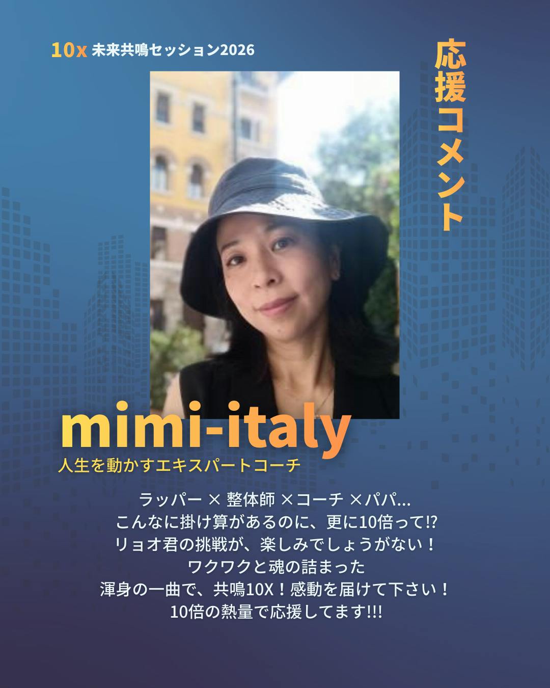 2026/03/18 10:2510X 未来共鳴セッション2026応援コメントいただきました!mimi-italyさん @mimi_italy_seikounou 人生を動かすエキスパートコーチ--応援メッセージ--ラッパー✕整体師✕コーチ ✕パパ…こんなに掛け算があるのに、更に10倍って!?リョオ君の挑戦が、楽しみでしょうがない!ワクワクと魂の詰まった渾身の一曲で、共鳴10X!感動を届けて下さい!10倍の熱量で応援してます!!!--終了--初めてミミさんを見かけたのはなんとYouTube動画!女性の方が量子力学をわかりやすく理論的に説明している動画を見て思わずチャンネル登録しそして、 公式LINEへ登録しました丸その後月日は経ち、年始の山崎拓巳さんの年始の会にて、たまたまお話ししていた方がなんとミミさんでした!驚きでした!そして、ホントに嬉しかったです。あれから、色々とお話させていただきいつも温かいメッセージをいただいているんです。今回のプロジェクト、みみさんが住んでいるイタリアからいつもエネルギーをもらっています!ミミさん、いつもホントにありがとうございます!共鳴整体師×人生を共鳴するラッパー@ryokawabata109 主催するイベント⬇10x未来共鳴セッション2026日時2026年5月16日(土)開場:12:30〜(予定)開演:13:00〜16:00会場銀座 THE BAGUS PLACE東京都中央区銀座2-4-6 銀座Velvia館 B1F(東京都中央区) イベント内容セミナー×ライブ×体験型イベント。「10x思考」をベースに、音楽・対話・ライブ・参加体験を通じて人生の未来を共鳴させるプログラム。 主な出演者(予定) 山﨑拓巳 さん(作家/夢実現プロデューサー) 名郷根修 さん(10x著者/株式会社ハイパフォーマンス代表取締役) 渡邉有優美(巡りの法則 著者/ヨガギネス認定者) 川畑亮 (共鳴整体師/ラッパー/変容プロデューサー) 懇親会(希望者のみ)イベント後に希望者向けの懇親会(交流会)あり(別途参加可) 定員・料金8800円定員:約120名3月2日よりクラウドファンディング開始!詳細は概要をチェックしてください!https://camp-fire.jp/projects/904628/view#クラファン#クラファン挑戦中#クラウドファンディング もっと見る