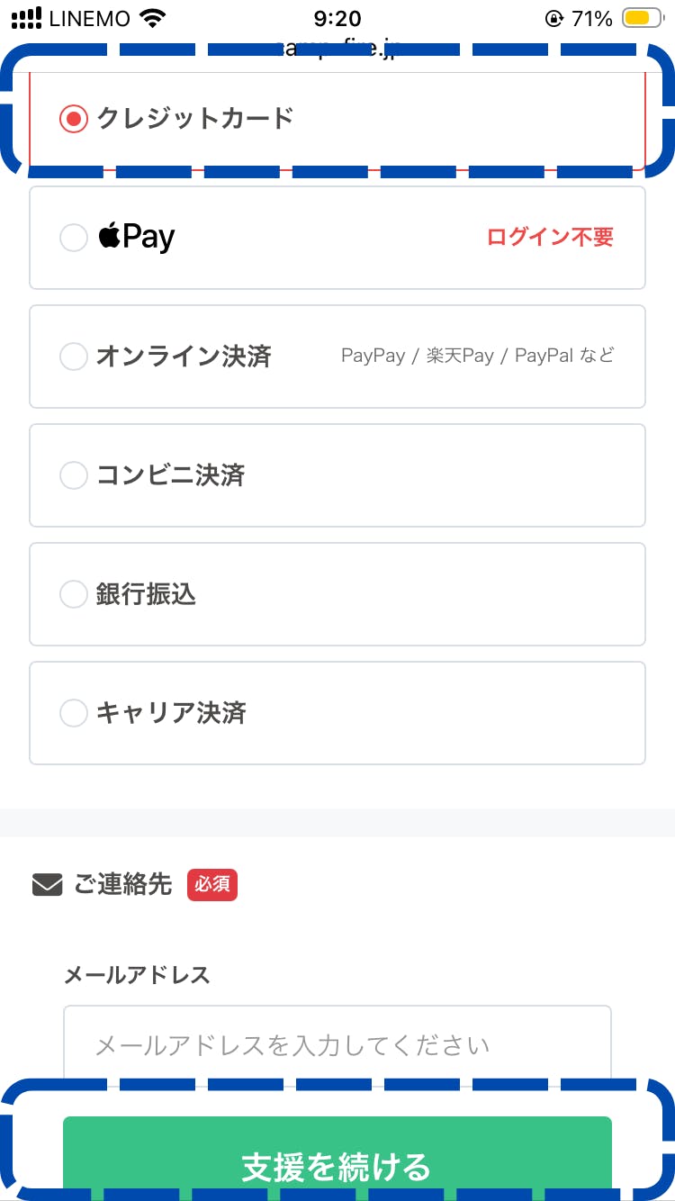 決済方法を選び、メールアドレスを入力して、「支援を続ける」ボタンを押します。