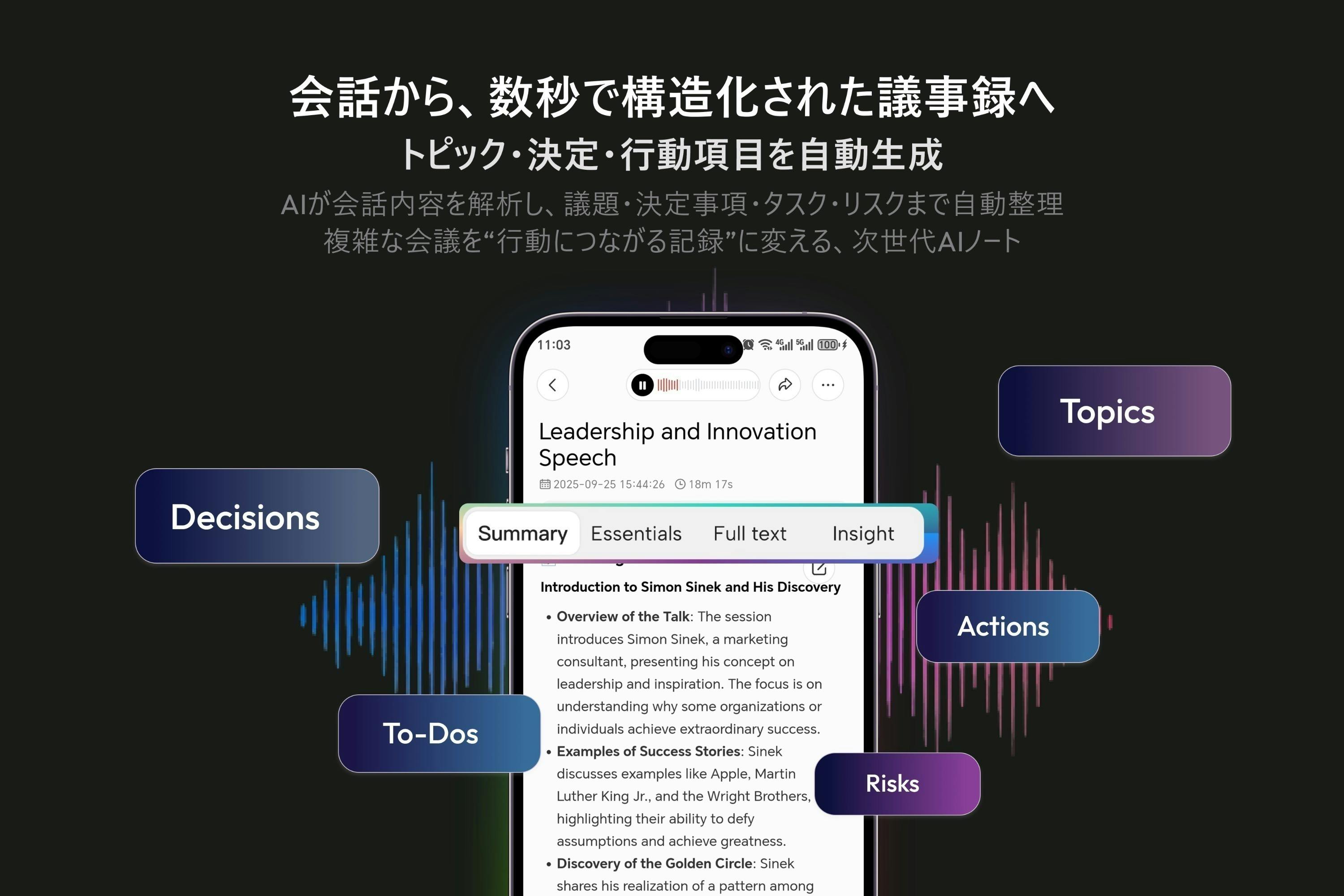 Botslab AI Note は、単なる録音機器ではありません。AIがあなたの会話を理解し、「重要な発言」「決定事項」「次のアクション」までを自動で抽出。