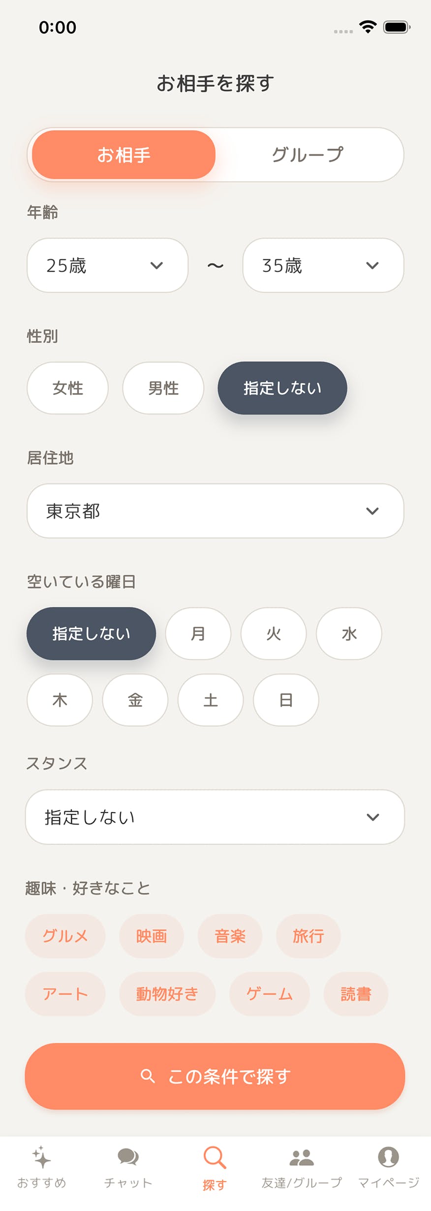 ・住所や趣味だけでなく、空いてる曜日やスタンスでも検索可能!気の合う理想の相手が必ず見つかります