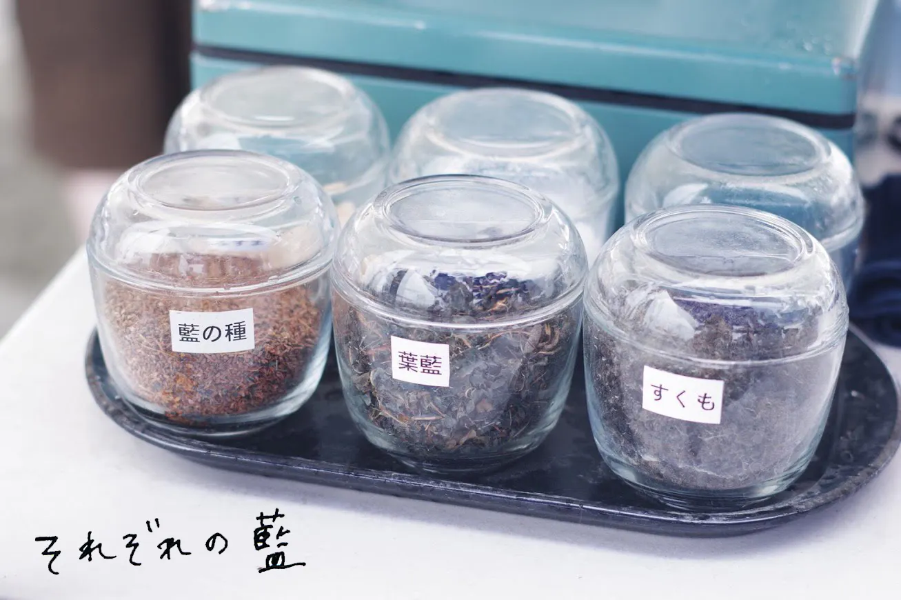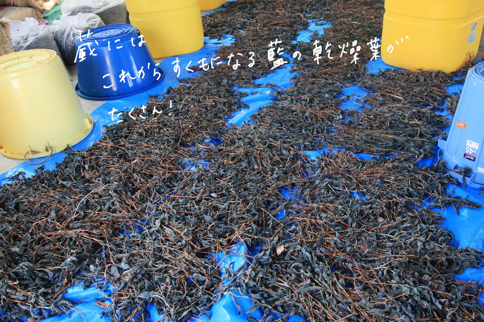 本藍は、蓼藍(タデアイ)を収穫し(3〜9月)、藍を発酵させた染料「すくも」を作り(9月〜12月)、藍建て(樫の木などの灰や日本酒などを入れて混ぜ、微生物の働きを活性化させ、ふすまや小麦の皮で糖分を加える)をすることで完成します。