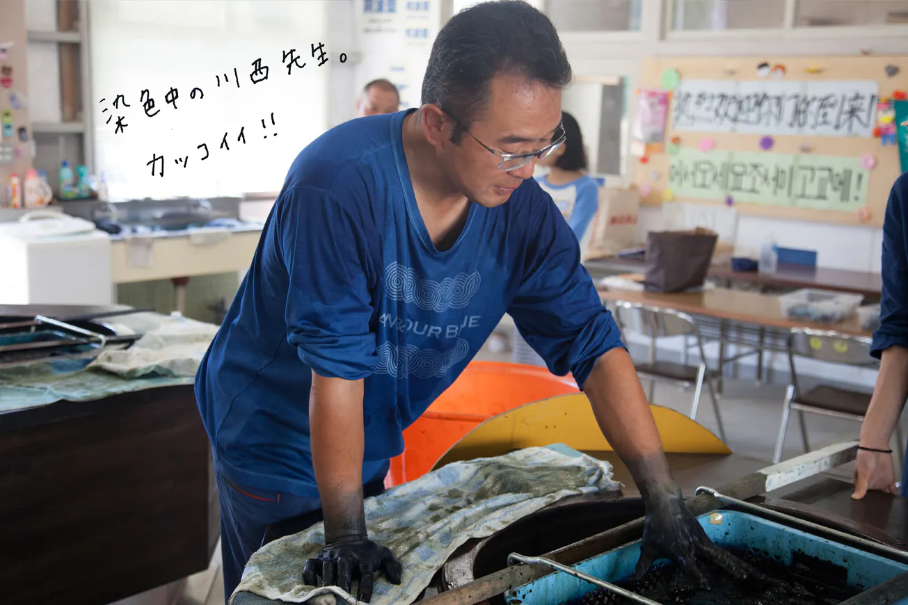 川西先生はご自身が苛性ソーダ入りの藍甕(科学的なものを混ぜ、早く簡単に染める手法があります)に手を入れてしまい、手中に疱疹が出来てしまった経験から、生徒には本物を伝えようという一心で、今回ワンピースを染めていただく本藍矢野工場の矢野さんのところに放課後や休日に通いつめたり、たくさんの協力を得ながら、何年もかけてこの環境を作られました。