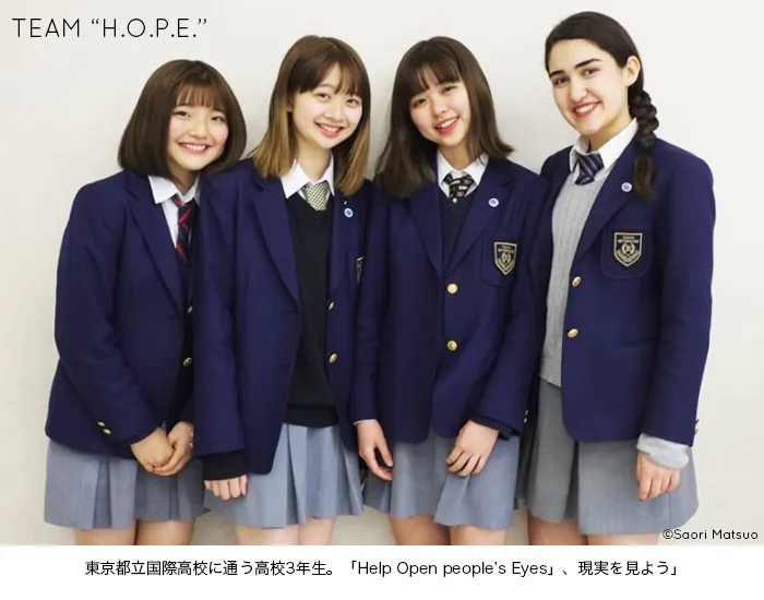 東京都・目黒区の駒場野公園近くにある東京都立国際高校に通う高校3年生のチーム「H.O.P.E.」。「Help Open people’s Eyes」の頭文字を取って付けられた名前には、「現実を見よう」という素敵な意味が込められています。