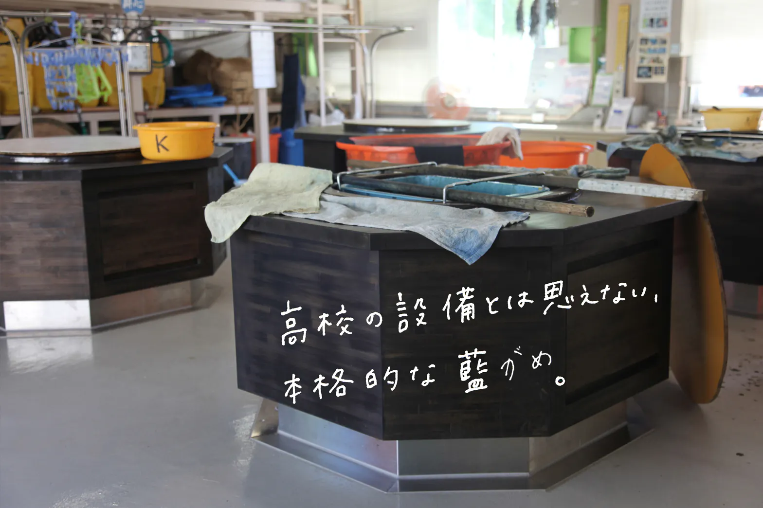 学校敷地内に畑、すくもを作る蔵、豪華な藍甕(あいがめ)が4つもあり、高校とは思えないクオリティの高さで藍染め活動をされています。