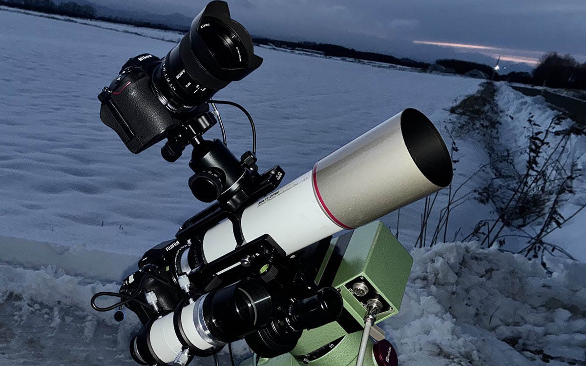 先日の新ひだか町でのテスト撮影は、強風のためガイドエラーが多発して星がブレずに写った画像が全撮影数の3割にも満たなかったので、今回は大きな赤道儀で臨みました。