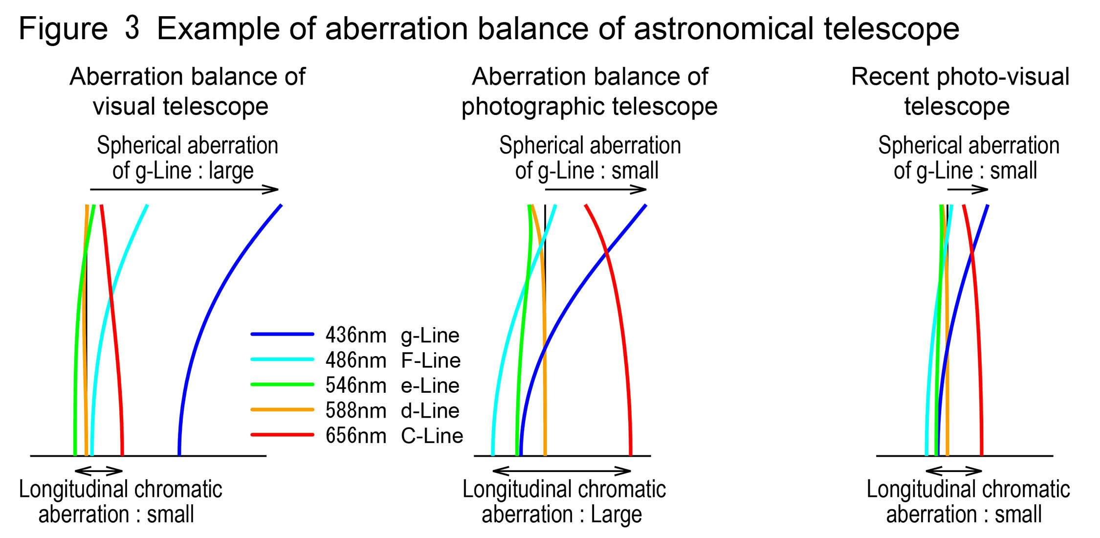 Since the human eye has difficulty perceiving colors with shorter wavelengths, traditional visual telescopes employed aberration correction that significantly diverged spherical aberration at the g-line.