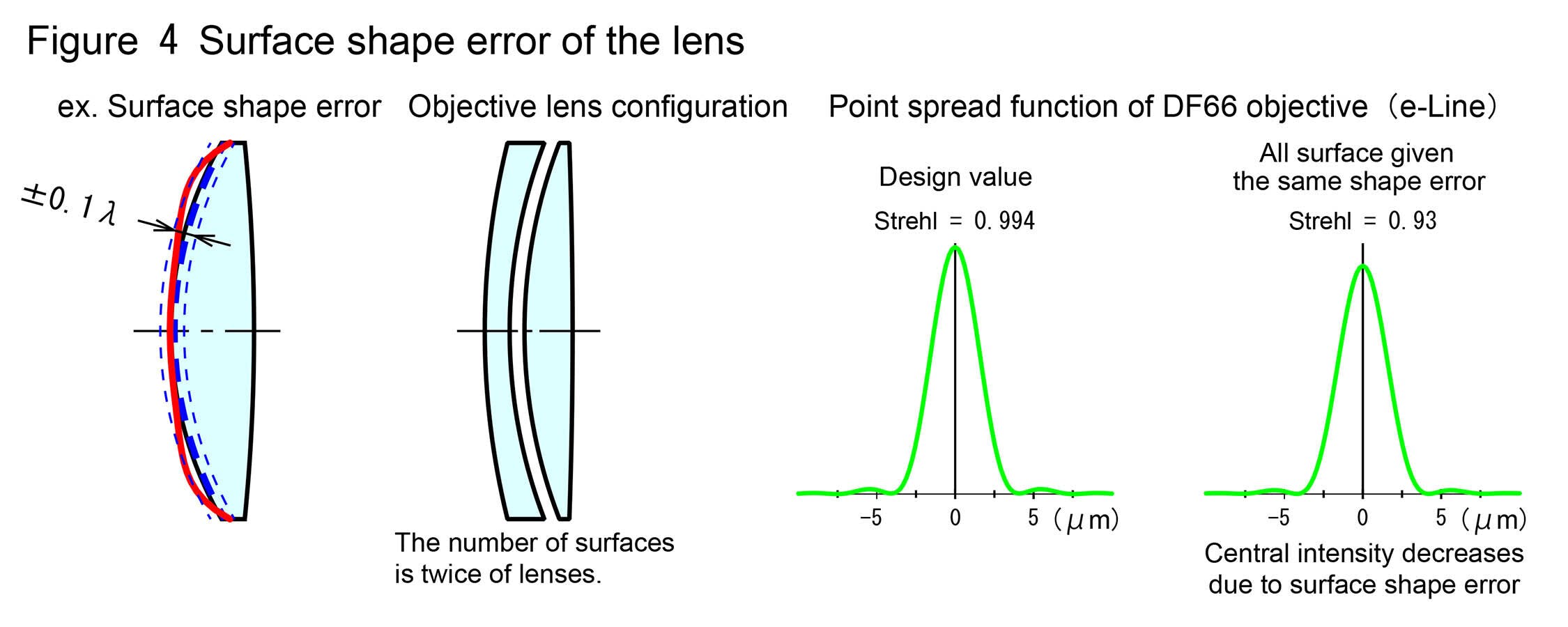The right side of Figure 4 shows the simulation results when this shape error is applied to all four surfaces of the DF66 objective lens.