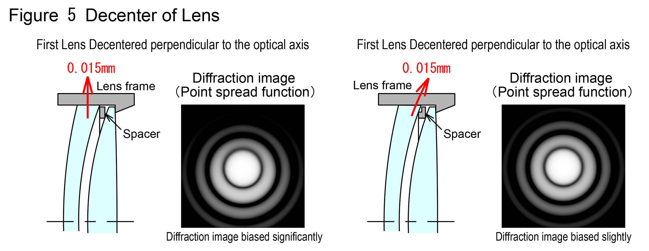 The left side of Figure 5 shows simulation results for the DF66 objective lens when its first element is decentered by 0.015 mm perpendicular to the optical axis.