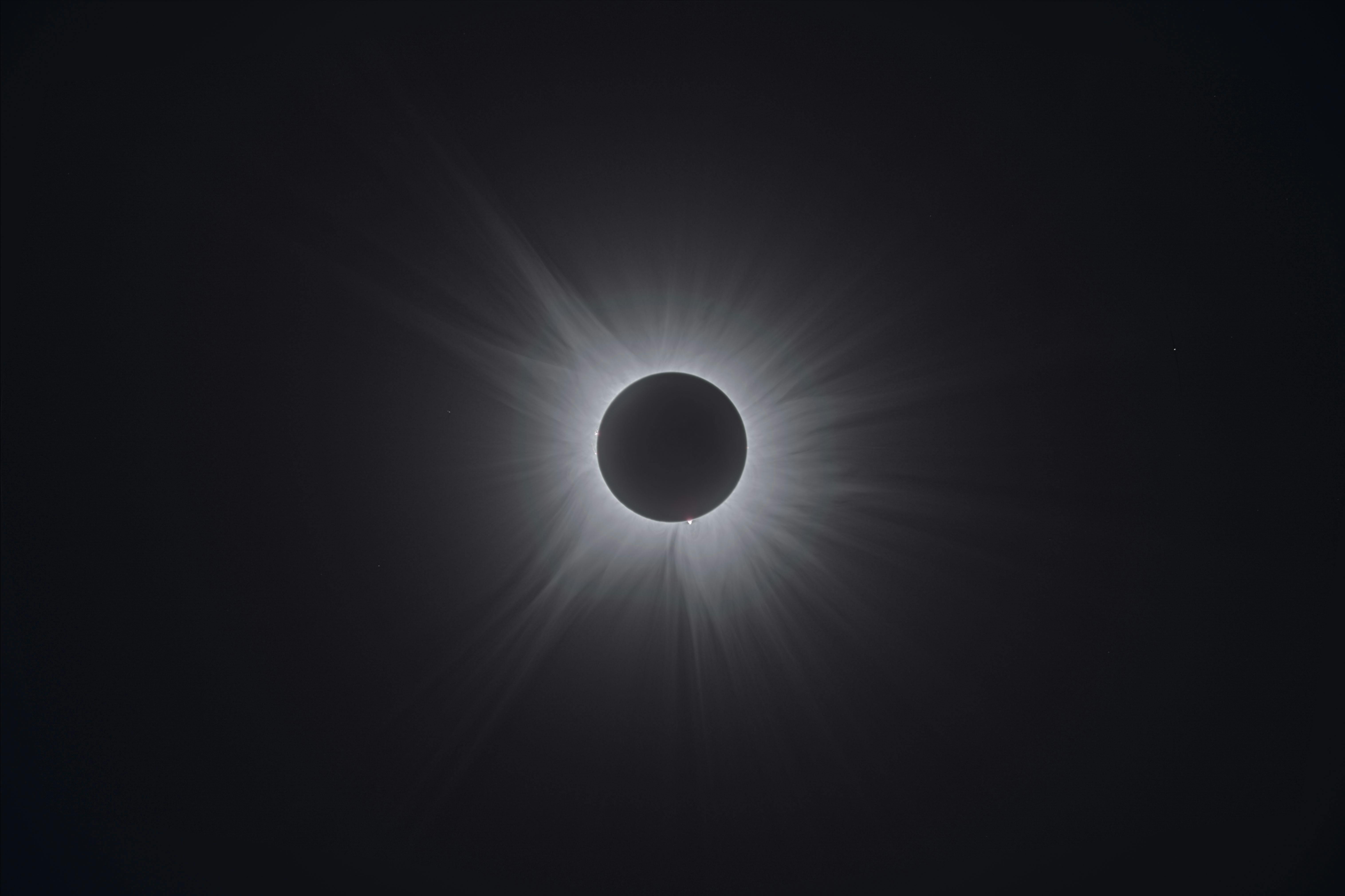 画像を右クリックして「名前を付けて画像を保存」すると、オリジナルサイズの画像を見ることができます。画像を拡大して見ると画像処理のアラが見えてお恥ずかしいのですが、周辺でも星が点像として写っているのがわかります。このため、外部コロナの微細な流線も写し出すことができるのです。