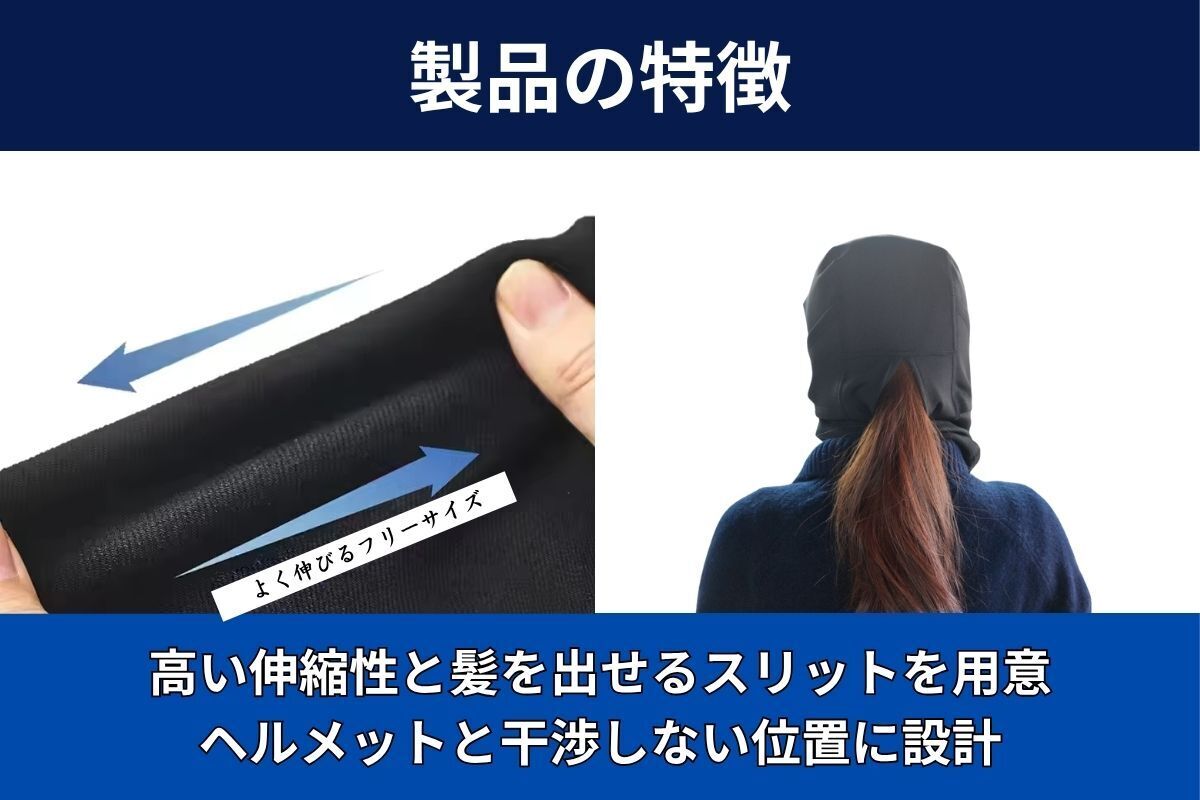 そこで、後頭部に髪を出せるスリットを設置した新設計バラクラバを開発。見た目も快適性も妥協せず、現場の声を形にしたアイテムとして立ち上げることにしました。