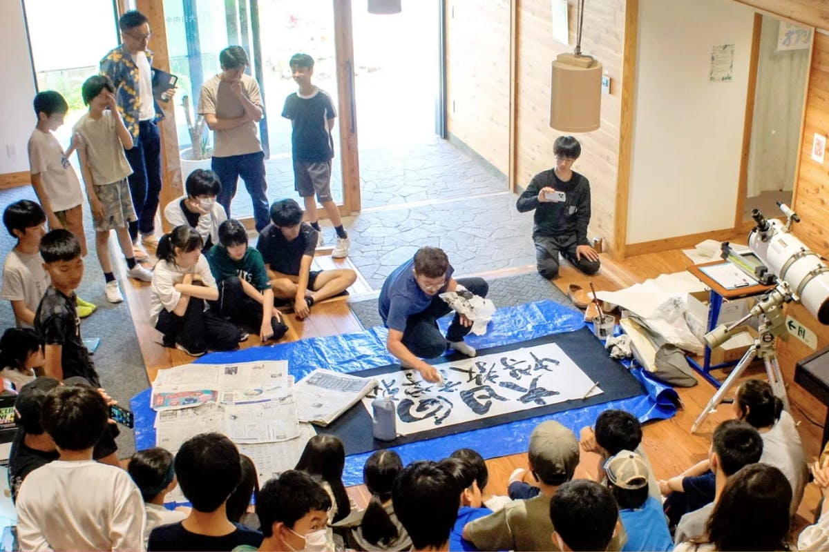 大日向中学校教頭による校名発表の書道パフォーマンスこのプロジェクトを支えるチーム