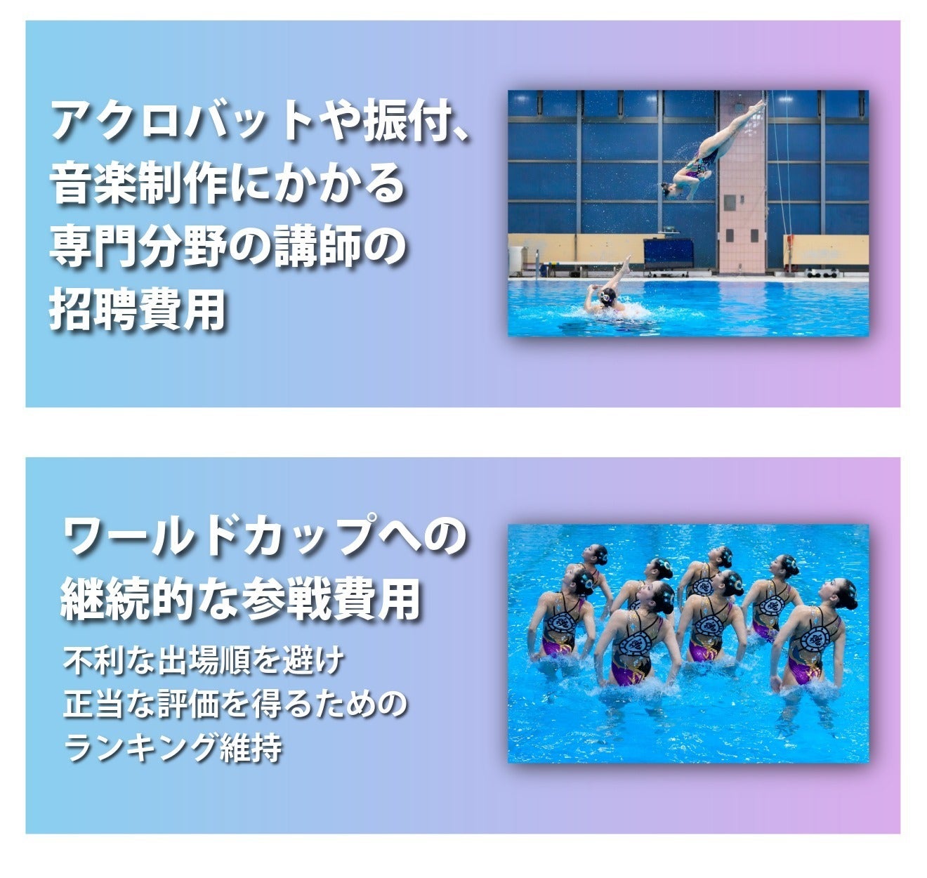また、新たなルールに適応しパフォーマンスの向上を図るためには音楽制作費や 振付・アクロバット講師の招聘費用も欠かせません。