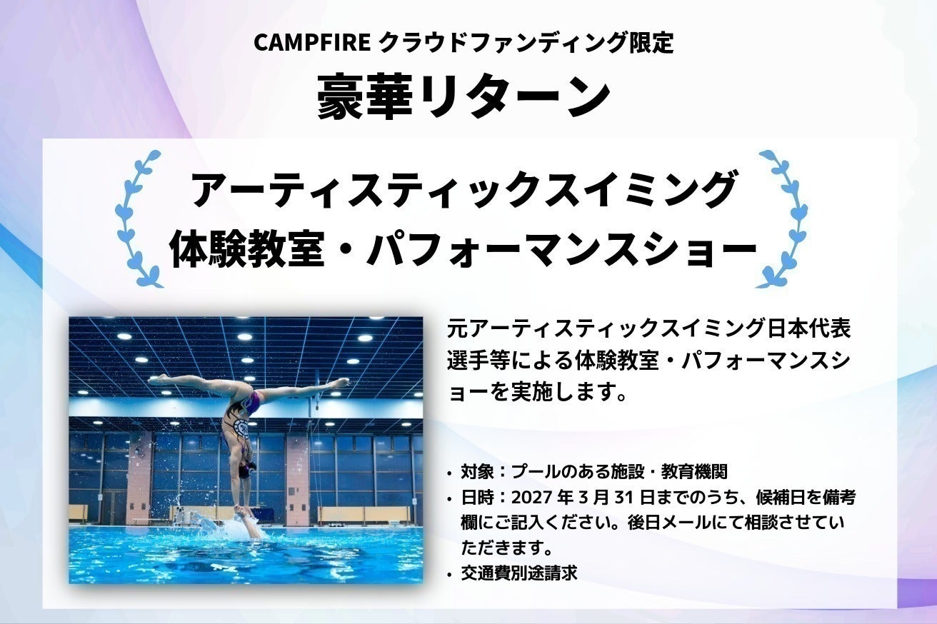 • クラウドファンディング開始から1か月が経ち、皆さまからの温かいご支援のおかげで、目標の90%に到達することができました。アーティスティックスイミング日本代表の挑戦に想いを寄せ、支えてくださっているすべての皆さまに、心より感謝申し上げます。皆さまからお寄せいただいたご支援一つひとつが、マーメイドジャパンの未来をつなぐ大きな力となっています。折り返しを迎え、残り1か月となりました。この挑戦を最後までやり抜くために、歩みを止めることなく、さらに支援の輪を広げていきたいと考えています。引き続き、この機会にお力を貸していただけますと幸いです。またお知り合いの方へも、私たちの想いを届けていただけますと嬉しく思います。▶ ご支援はこちらからhttps://camp-fire.jp/projects/905017/view もっと見る