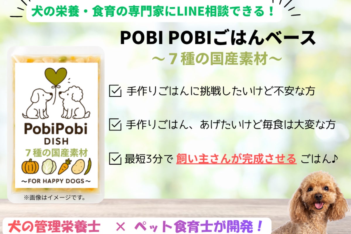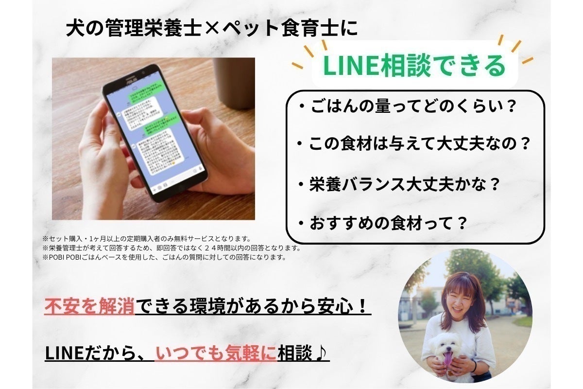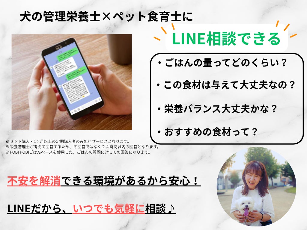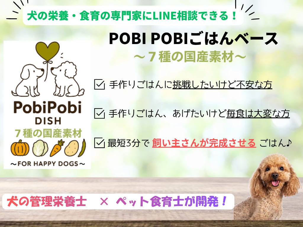 手作りごはんを相談できる人が周囲にいる方は少ないかと思います。相談しようとすると30分で3,000円、5,000円などと高額にお金が掛かってしまいます。POBI POBIごはんベースはLINE相談サービスが付帯しているため、常に実質的に犬の管理栄養士とペット食育士が飼い主様をサポートいたします!