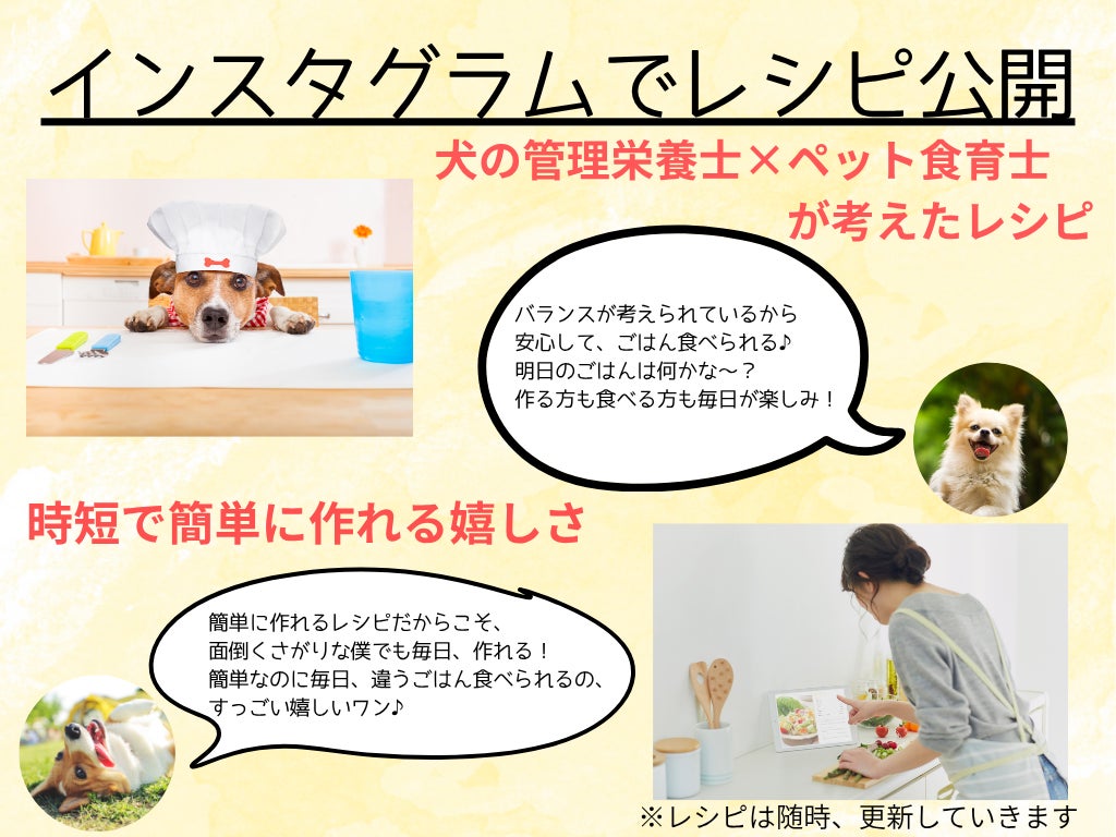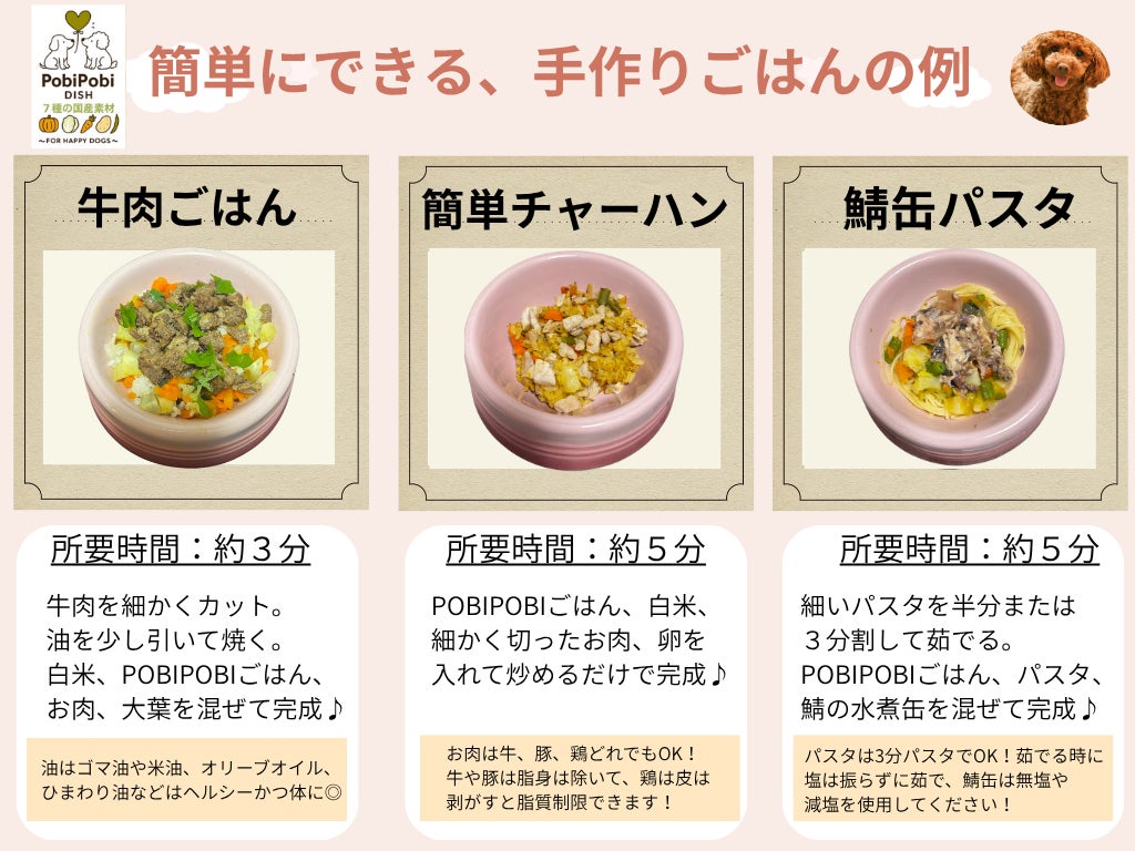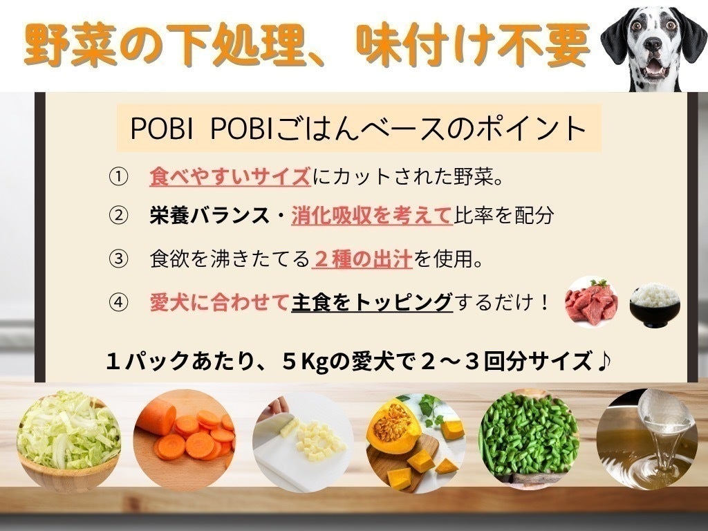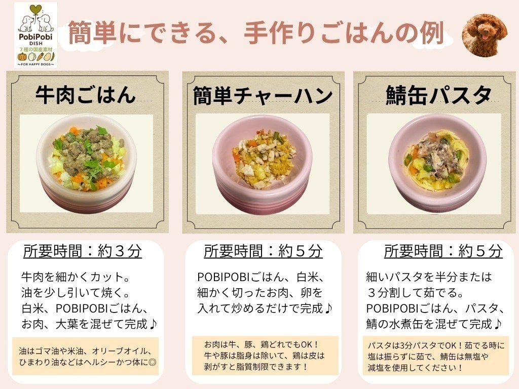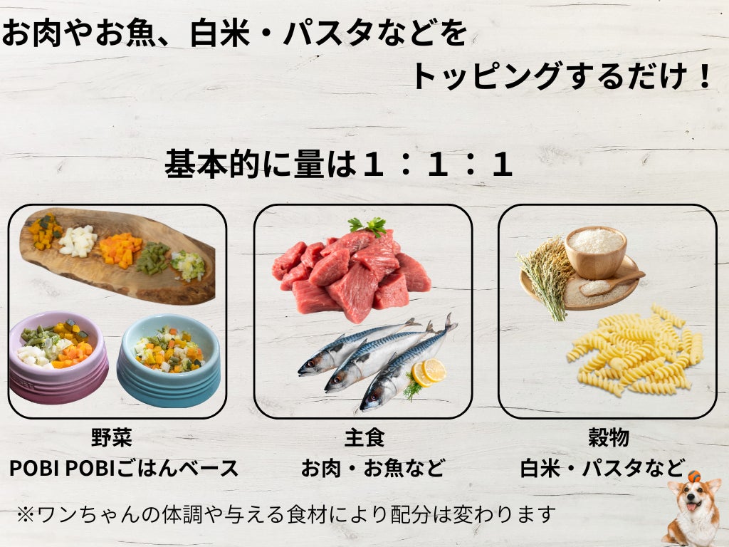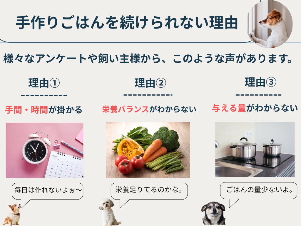 飼い主様からの声で多くある、「手間や時間が掛かる」、「栄養バランスが不安」、「与える量がわからない」を全て解決する、手作りごはんのベースを開発いたしました!