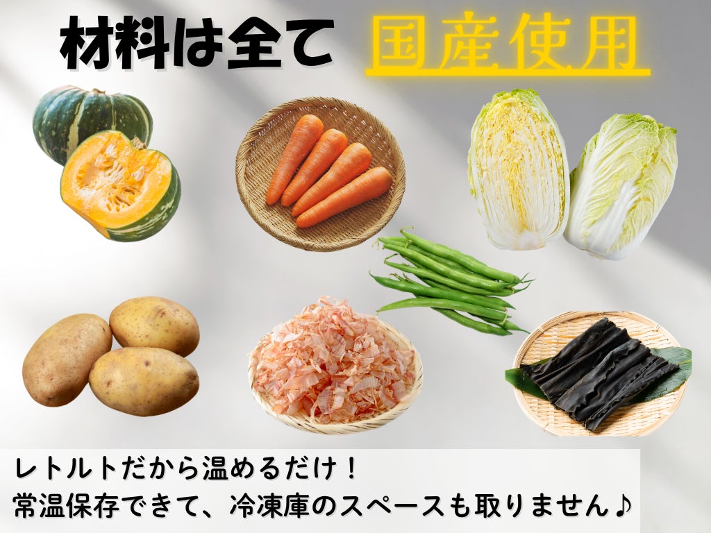 使用している食材:白菜、にんじん、かぼちゃ、じゃがいも、いんげん、昆布出汁、鰹出汁。
