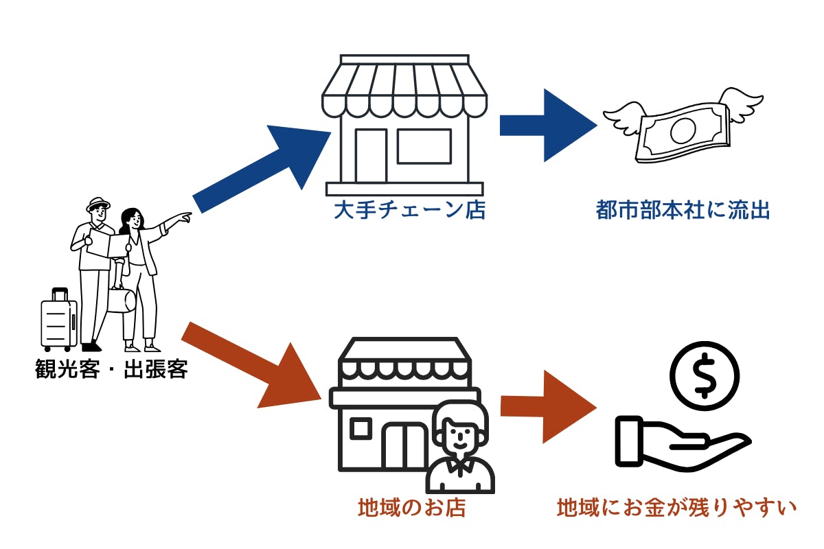 訪日観光客からすれば良く分からないお店に入るよりも大手チェーン店などよく知っているお店に入る方が安心するので、チェーン店にお金が落ちていく。(お金の流出)