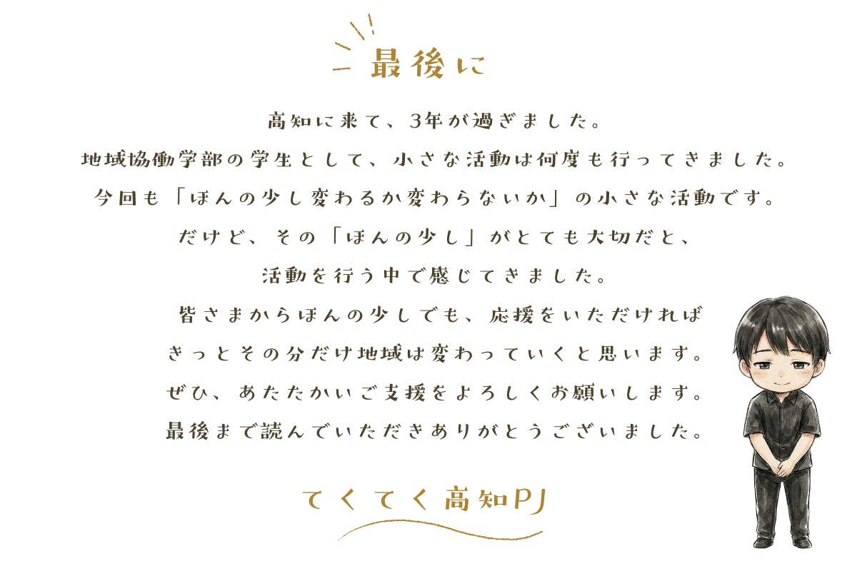 本クラウドファンディングは、この活動を高知市中心商店街でも実施したい!という想いで始めました。