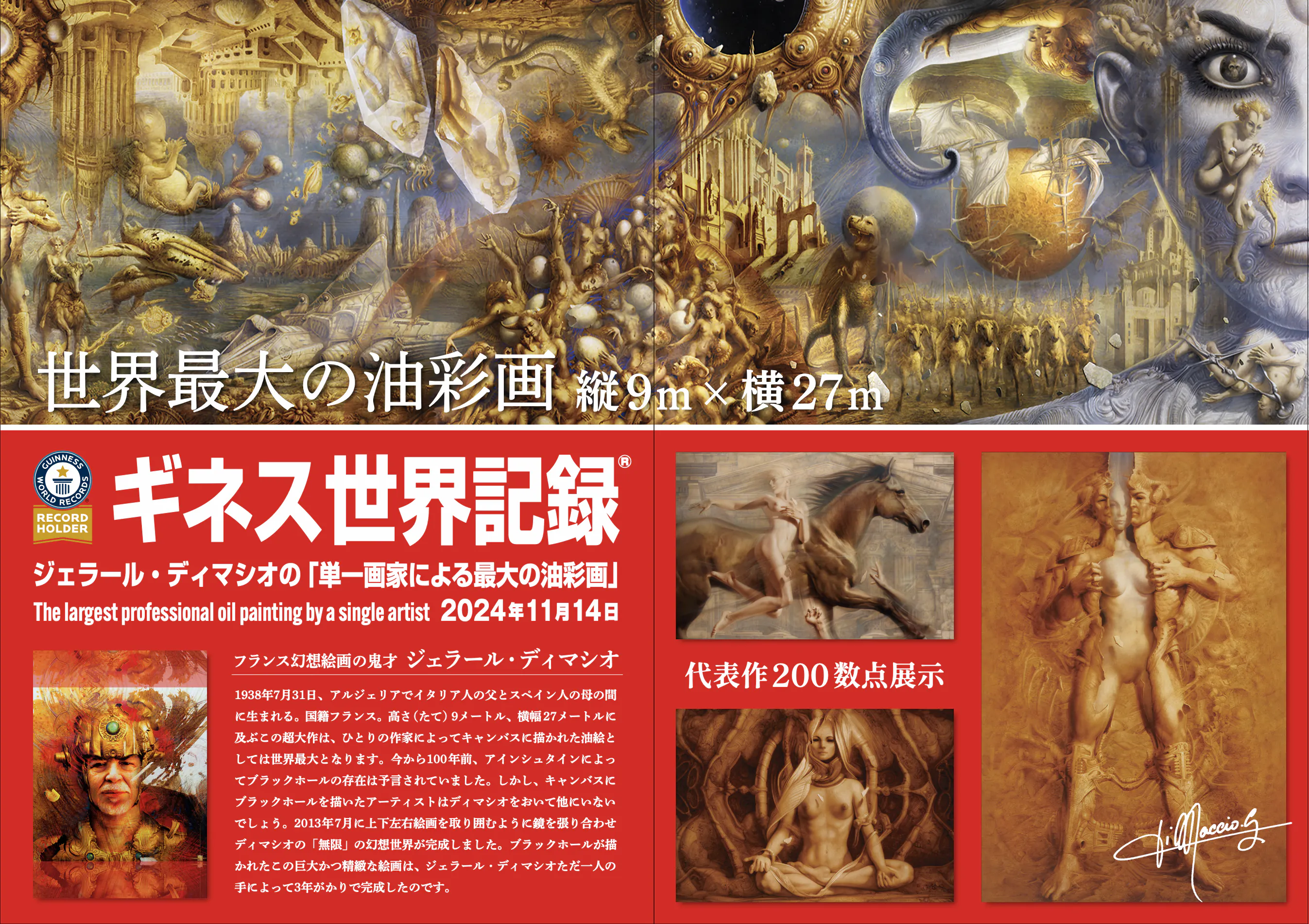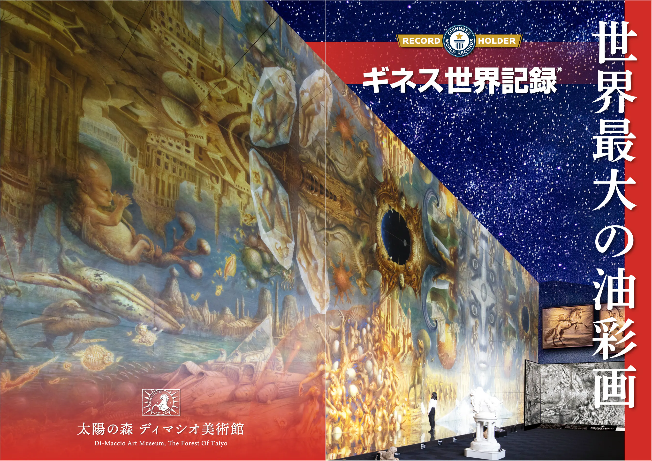本公演のテーマ作品である、ジェラール・ディマシオの巨大油彩画(縦9m×横27m)をはじめ、200点以上の作品を常設展示しています。ルネ・ラリックのガラス作品や日本の画家たちの油彩・デッサンも揃い、光と音の演出で巨大絵画の表情が時間ごとに変化します。