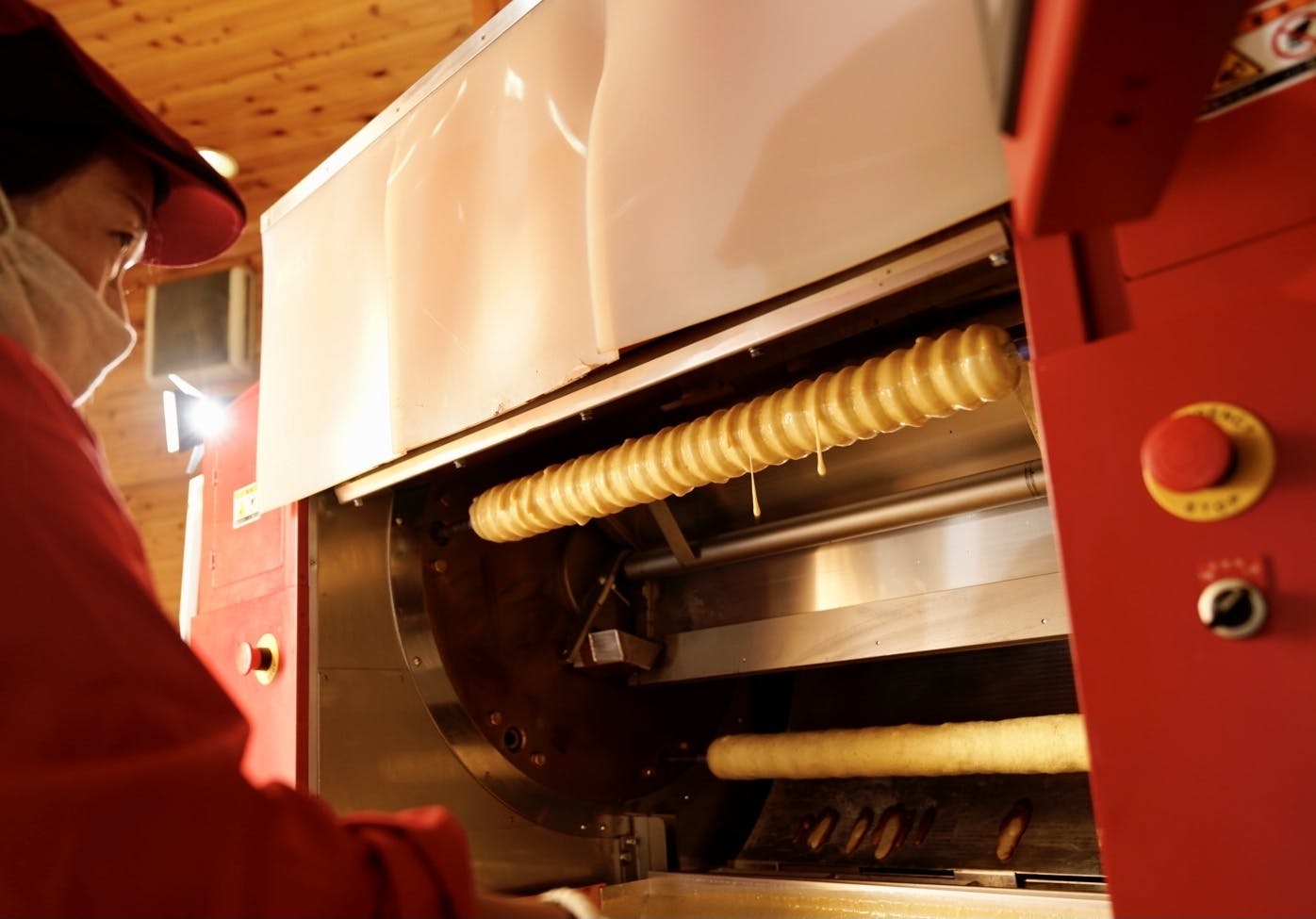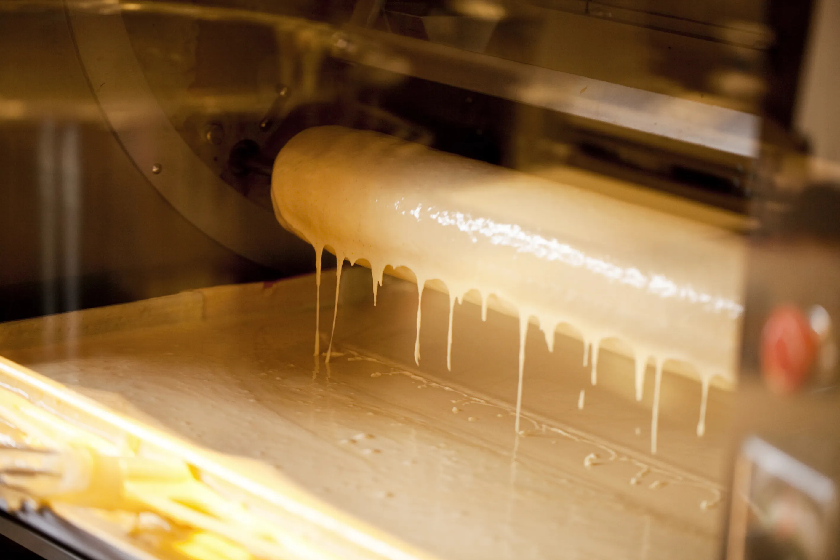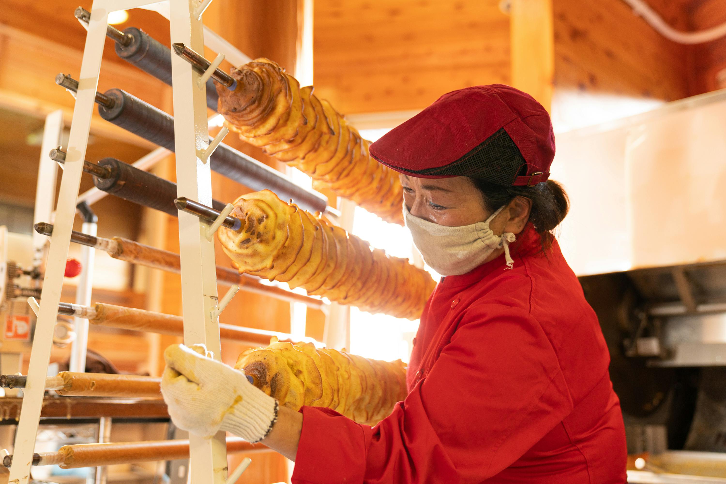 生地皿にある生地が木の棒にまとわりついて、オーブンに入り焼かれてを繰り返す。
