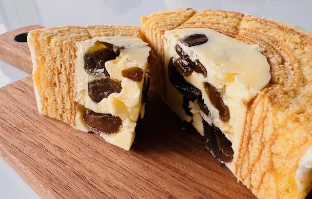 ”朝倉産シャインマスカットを干し葡萄にして、ゑびす酒造さんのホワイトラムに漬け込み、発酵バターとホワイトラムで作ったラムバターを、あさくら幸せレモンバウムクーヘンの穴の中に入れたラム酒薫る大人のホワイトラムバウムクーヘン”です💦
