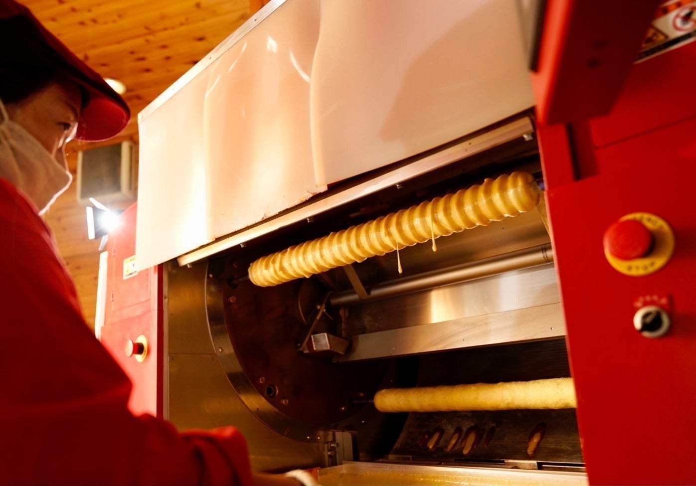 生地皿にある生地が木の棒にまとわりついて、オーブンに入り焼かれてを繰り返す。