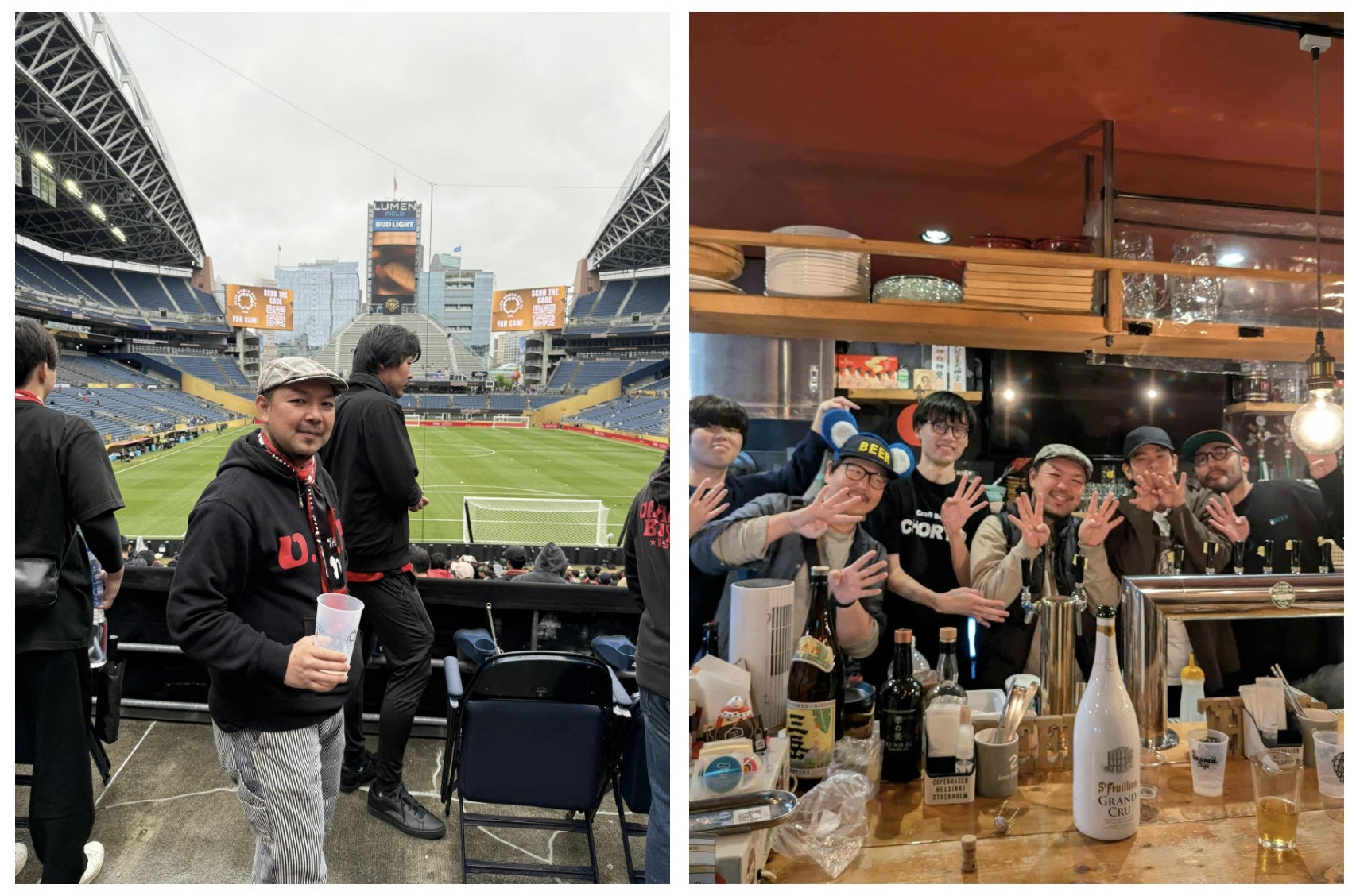 左:クラブワールドカップ(シアトル)にて撮影 右:店舗にて醸造士を招いてのイベントにて