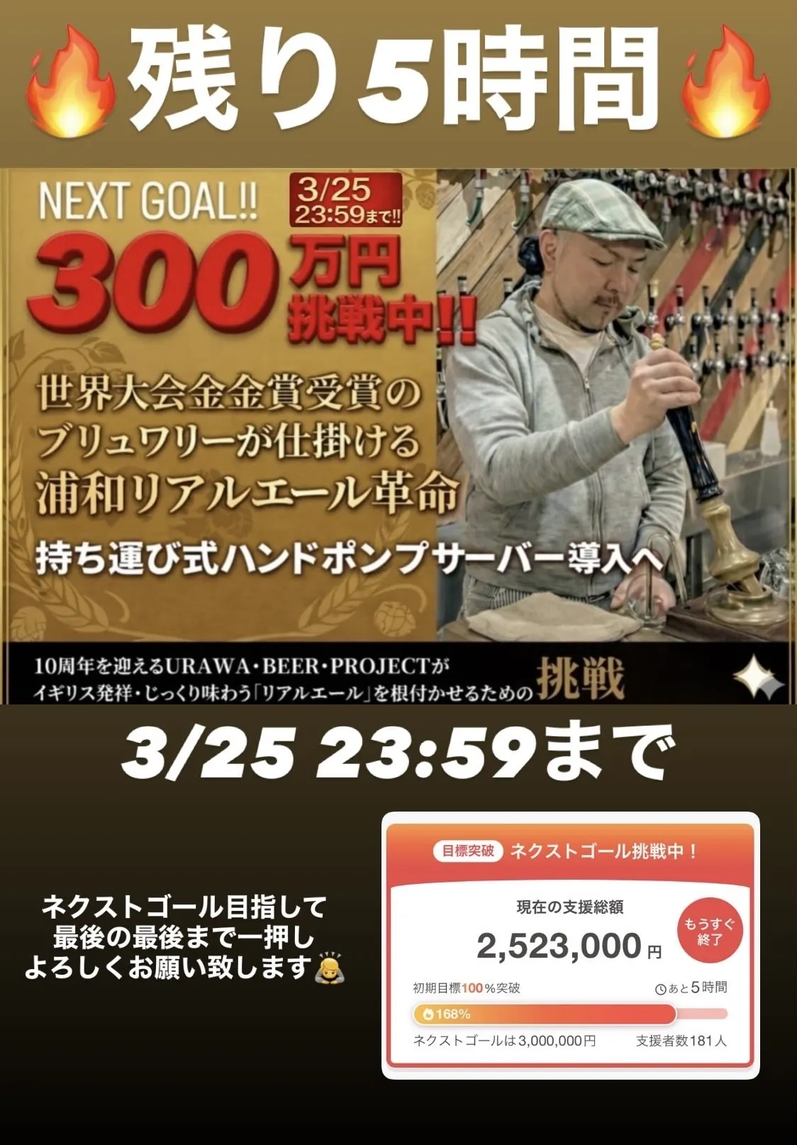 前回の5年前のU.B.P BREWERY設立時のクラファンもラスト5日のラストスパートが全体の4割程の応援・ご支援だったので今回も最後まで諦めずにネクストゴール300万の達成目指します。