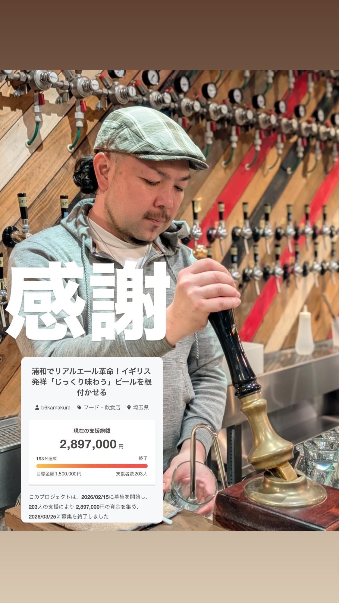 2026/03/26 15:27【感謝】2月15日〜3月25日23:59までの期間、ハンドポンプサーバー導入プロジェクトにお付き合い頂きましてありがとうございました。「フットボール×ビールの新しいカルチャーを浦和から世界へ」クラウドファンディングは3月3日に初期設定クリアネクストゴールに向かって最後までご支援などありがとうございました。初期ゴールのBEER HUNTING URAWA導入のハンドポンプサーバーは4月2日に日本に到着予定。4日に現物が店舗着、この日に業者に現物確認頂き、9日-10日に設置工事、11日にクラファンお披露目コースのお披露目会のスケジュールで動いております。ハンドポンプサーバーの輸入が予定より遅れてギリギリのタイミングですが不備のないことを祈る限り。皆様、BEER HUNTING URAWAでのリアルエール提供を楽しみにお待ち下さい。また、ネクストゴールまでは届きませんでしたが最後まで背中を押して頂きありがとうございました。持ち運び式ハンドポンプサーバーに関しては現在、補助金などを駆使して導入出来ないかを探っております。時間は掛かるかもですが実現出来るよう動いていきます。他にも今回の支援金を使用して皆様に楽しんで頂けることをやっていきたいと思いますので、今後ともBEER HUNTING URAWA、BEERNOVA URAWA、U.B.P BREWERYをよろしくお願い致します。株式会社URAWA・BEER・PROJECT代表 小林 健太(かまくら) もっと見る