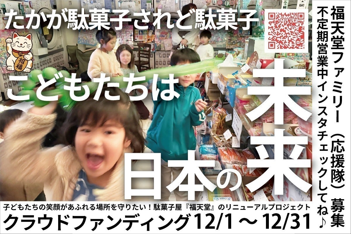 2025/12/31 07:00ご支援・応援いただいた皆さま、本当にありがとうございます。いよいよチャレンジも最終日となります。ここで一つお知らせがございます。実は、事情によりコインランドリーでの営業について継続が難しい状況となっております。これは応援していただいた皆さまに大変申し訳ありませんし、私たちとしても非常に残念です。ですが、地域を結ぶ駄菓子屋として福天堂は継続して参ります。今後は場所を変えての営業や移動式駄菓子屋としての活動などを検討しています。本プロジェクトでのご支援は福天堂を新たな形で続けていくための資金として活用させていただきます。当初の予定と変わってしまい大変恐縮ですが、これからも福天堂を応援していただけますと幸いです。 もっと見る