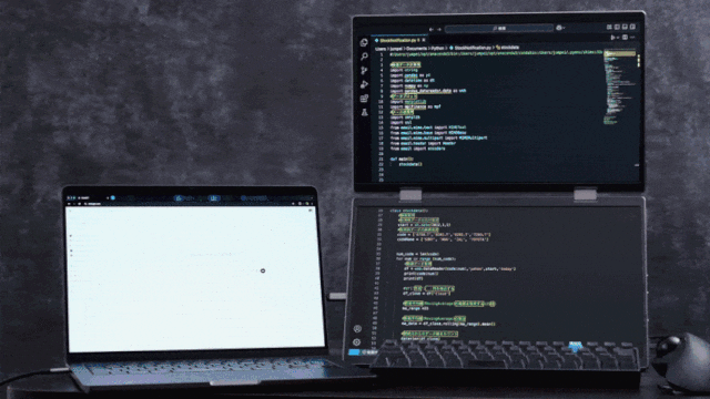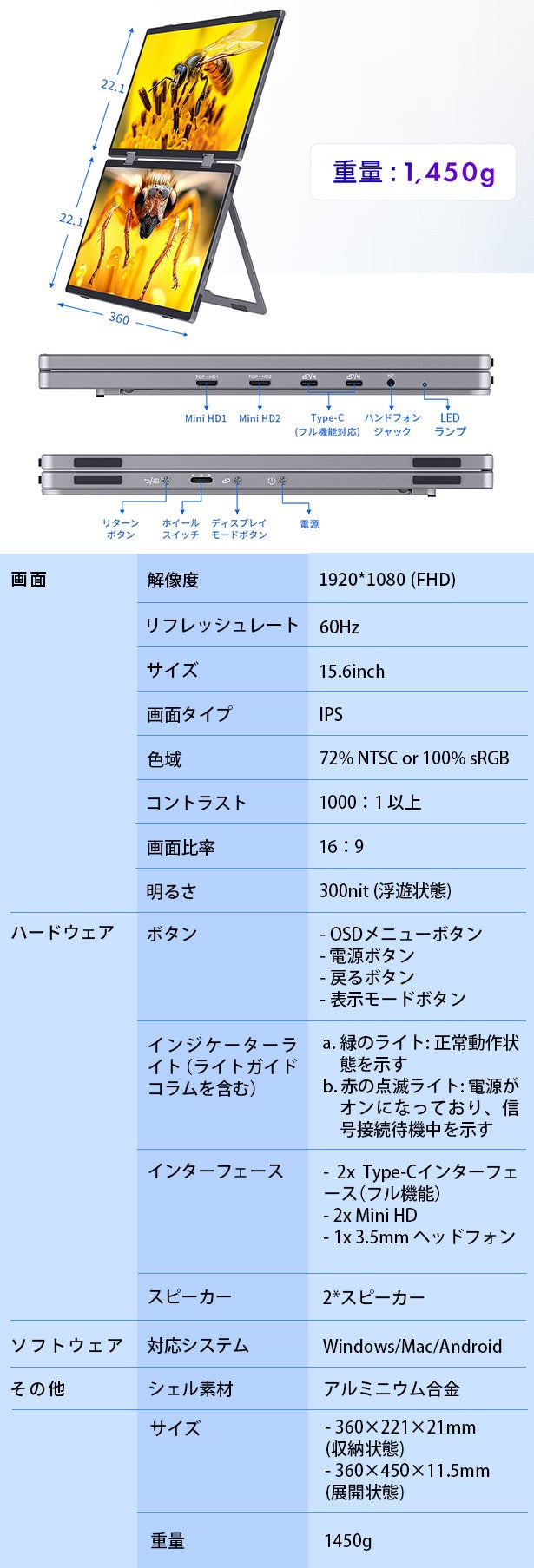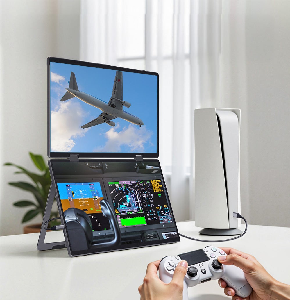 CrowView Yogaは、15.6インチの1080PフルHD IPSディスプレイを2枚搭載しており、鮮やかな色彩と広い視野角を実現します。画像編集、プログラミング、ゲームなど、どのような用途でも高精細な映像が作業効率を向上させます。