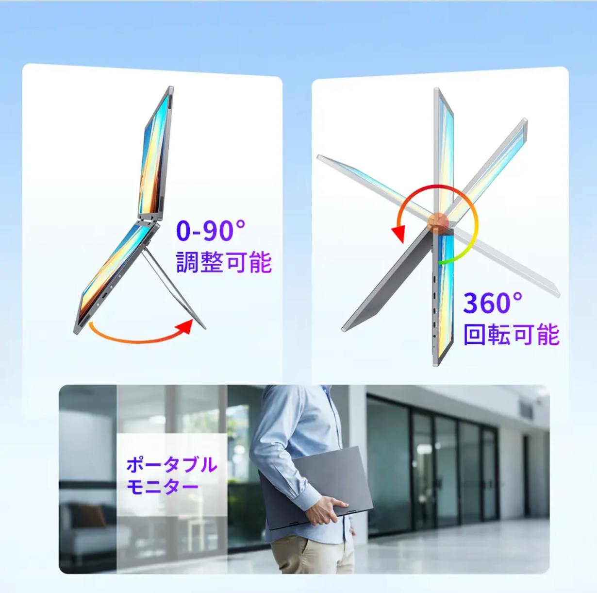 仕事のサブディスプレイとして活躍し、作業効率が大幅に向上!さらに、ゲームや動画、映画鑑賞にも使えて、場所を選ばず外出先でも快適に楽しめます。