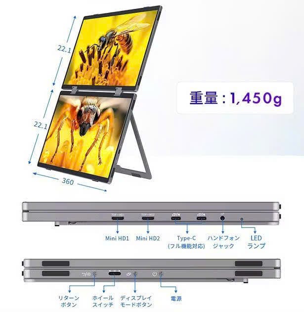 「モバイルディスプレイは重そう…」というイメージを覆すのが、CROWVIEW YOGAの軽量ボディ。その重さはなんと約1,450g。これは多くのノートパソコンよりも軽く、バックパックやショルダーバッグにも簡単に収納できるサイズ感です。さらに、筐体にはアルミニウム合金を採用し、軽量ながらも高い耐久性とプレミアム感を実現。ビジネスシーンでも映える、洗練されたデザインとなっています。