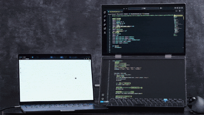<縦横どちらにも自在に展開できる2画面ディスプレイで、省スペースでも作業効率を大幅アップ。360°回転により画面共有もスムーズで、打ち合わせやプレゼンがより手軽に。わずか1,450gの軽量・コンパクト設計で、どこでも据え置き級の快適な作業環境を実現します。>