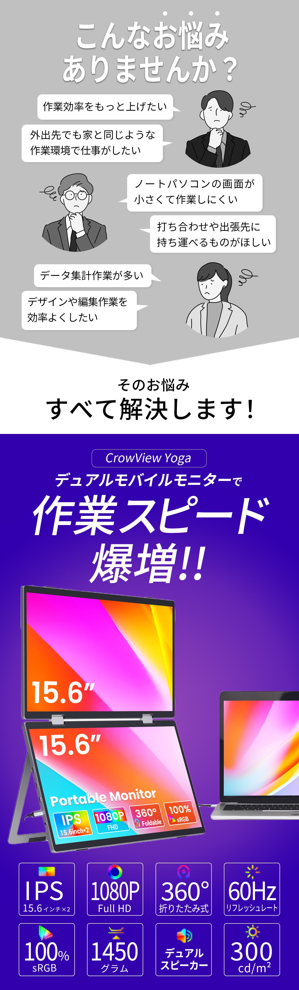 360度折りたたみ可能なデザインと2画面構成により、どこでもデスクトップ並みの作業効率を実現します。ここでは、CrowView Yogaがモバイルワークやクリエイティブな作業に最適な理由をご紹介します。