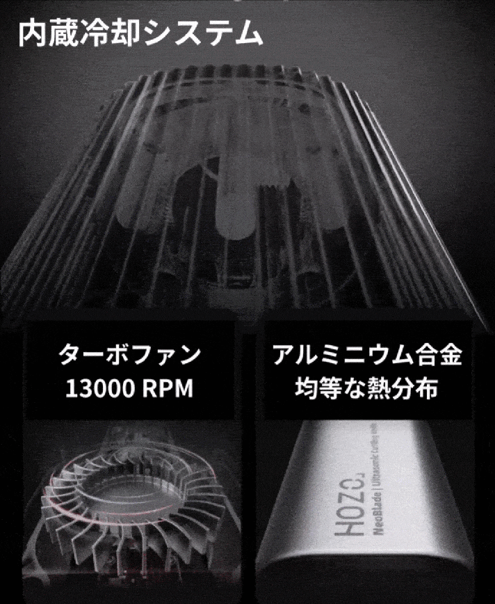 超音波カッターは本体や刃に熱を持ちやすいのが注意点ですが、「NeoBlade」では高速冷却ファンとアルミボディで本体冷却にもこだわっているのがポイント。