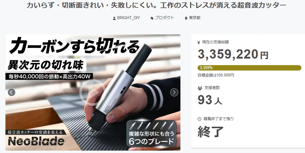 2026/04/01 20:57サポーター様、力いらず・切断面きれい・失敗しにくい。工作のストレスが消える超音波カッターにご興味をお持ちいただきありがとうございます。プロジェクト開始から39日目で93人ものご支援者の方々より支援頂き、無事プロジェクト終了を迎えることが出来ました。早速皆様のリターンを2026年06月末にお届けできるよう準備を始めております!皆様にご満足いただけるリターンをお届けできるよう、全力で取り組んで参りますので引き続き、「力いらず・切断面きれい・失敗しにくい。工作のストレスが消える超音波カッター」をよろしくお願い致します。BRIGHTチーム もっと見る