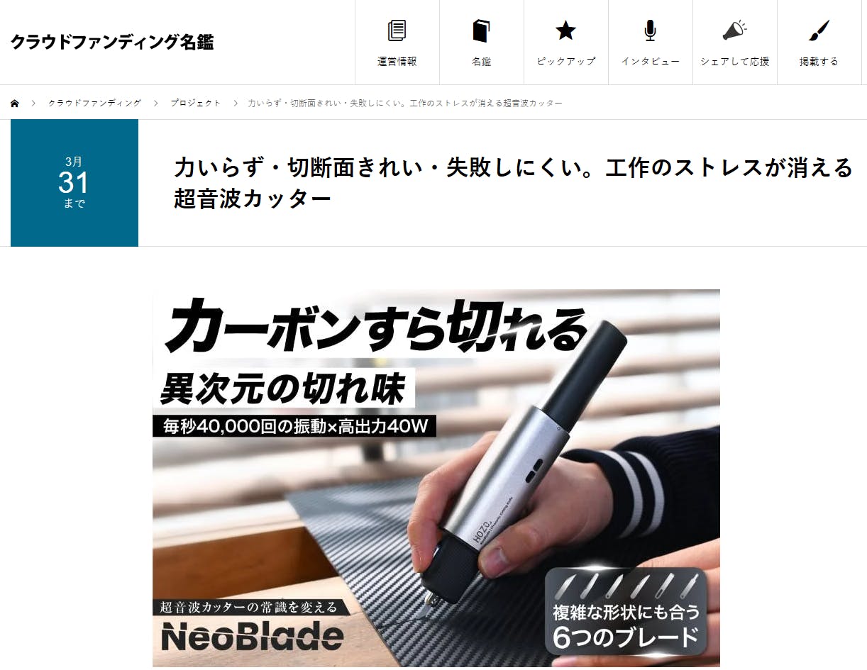 2026/02/28 21:00皆様、こんばんは!Bright DIYチームです。先日、クラウドファンディング名鑑で「NeoBlade」を紹介して頂きました。話題:力いらず・切断面きれい・失敗しにくい。工作のストレスが消える超音波カッター興味がある方、是非下記のリンクからアクセスしてみてください。https://crowdfunding.meikan.org/project/campfire-905374/【レビューの一部抜粋】〈NeoBladeは、毎秒数万回の超音波振動を利用するコードレス超音波カッターです。40Wの高出力により、3mmアクリルや8mm合板、多芯ケーブルなどの硬く厚い素材もスムーズに切断可能。素材の抵抗を検知して出力を自動調整するため、常に最適な切れ味を維持できます。軽量・コードレス設計で、長時間作業でも扱いやすいのが特長です。通常モードとパルスモードを切り替えられ、6種類の専用ブレードで3Dプリント部品の整形や基板加工、革細工など幅広い用途に対応。ターボファンとアルミ合金ボディによる冷却機能で発熱を抑え、安全ロックや自動シャットダウン、LEDライトなど安全性にも配慮されています。専用ナノテックカッティングマットの使用が推奨され、交換式バッテリー2本やUSB-C充電、充電スタンドなど利便性も充実。安全キャップや収納ボックスも付属し、快適で効率的な作業環境を実現する高機能ツールです。〉ご興味のある方はこの機会をお見逃しなく!https://camp-fire.jp/projects/905374/view3月31日まで販売期間は続きますので、ぜひSNSでのシェアや身近な方にもおすすめしていただけると嬉しく思います。#neoblade #brightdiyどうぞよろしくお願い致します。BRIGHTチーム もっと見る