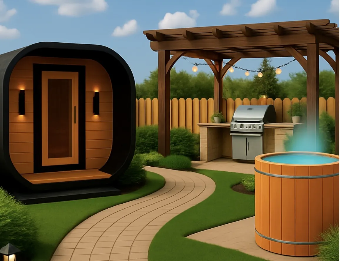プライベート空間を厳守する為、簡易室内スペースの裏にサウナを設置致します。敷地内は外から観れないように囲いをしておりますのでご安心下さい。