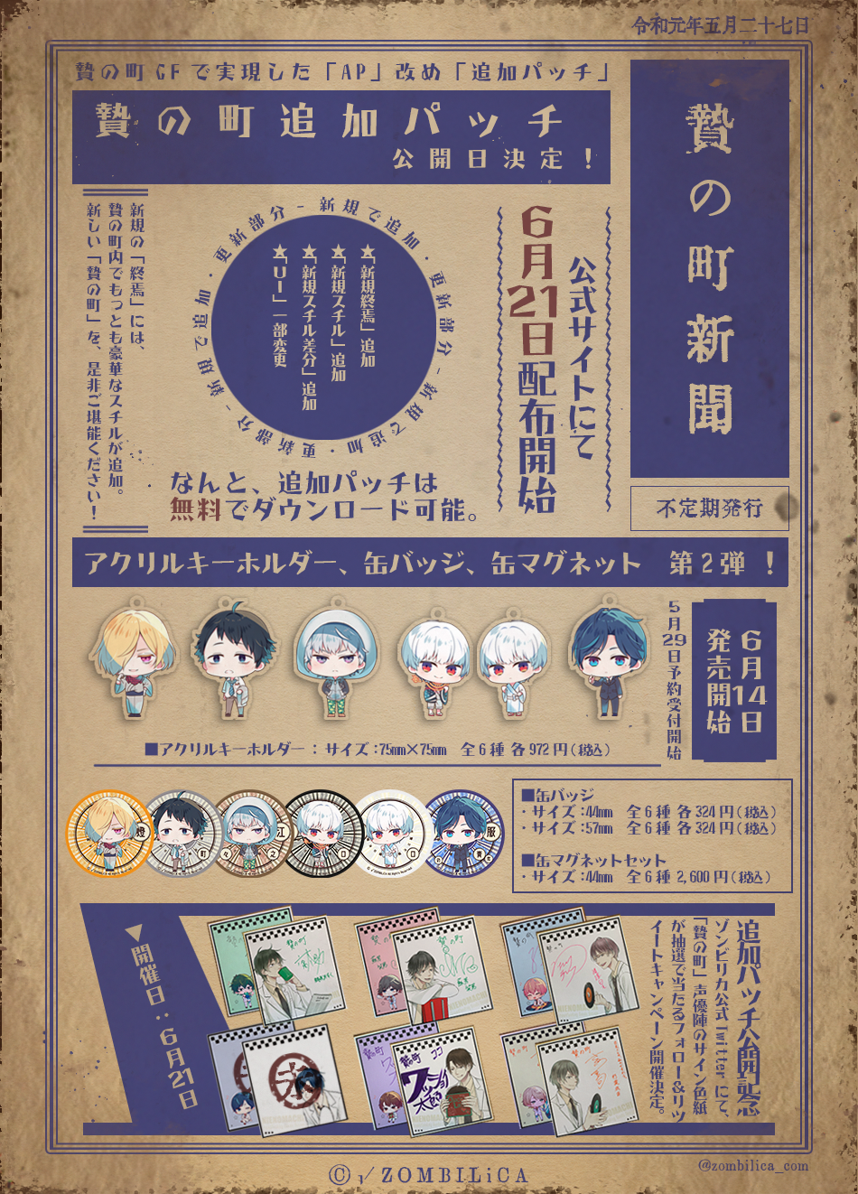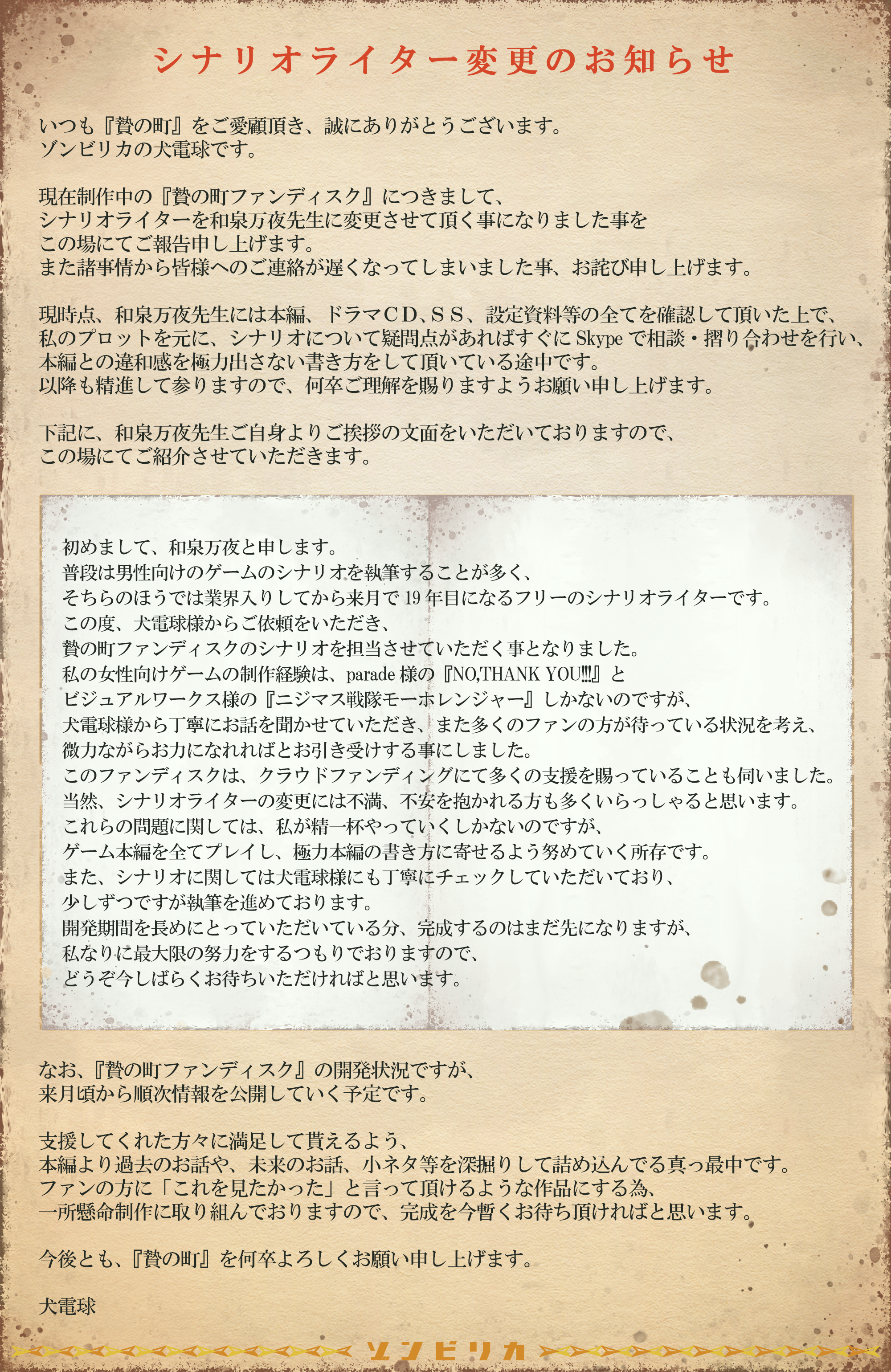 平素は格別のご高配を賜り厚く御礼申し上げます。ゾンビリカです。ご報告が遅くなりましたが、お陰様で「贄の町」クラウドファンディングのご支援のお陰で実現する事になった「贄の町追加パッチ」を無事2019年6月21日に公開致しました!★追加パッチ詳細(Twitterに飛びます)もう楽しんで頂けましたでしょうか?大好きで大切な「贄の町」に、新しいストーリーやスチル、UIを追加・変更する作業は、ただのデータのアップデートではなく、大切な宝箱に新しい宝物を入れていくようなワクワクした気持ちでした。ご支援頂いた皆様のおかげです。本当ににありがとうございます……!是非、沢山の人に追加要素を楽しんで貰いたいと思っておりますので、まだ未プレイの方は、プレイして頂けると嬉しいです!また本日から、「追加パッチ公開記念 贄の町出演声優サイン色紙プレゼントキャンペーン」を開催致しました。★サイン色紙プレゼントキャンペーン詳細(Twitterに飛びます)宜しければ、是非ご参加下さい。以上となります。引き続き、皆様のご支援でお届けする事が出来る事になった「贄の町ファンディスク」の制作に奮励して参りますので、今後とも応援を宜しくお願いいたします!★ゾンビリカの情報は随時Twitterにて発信しております!https://twitter.com/zombilica_com-----------------------------------------------------------------★ゾンビリカお問い合わせ窓口:Zombilica_info@zombilica.com★ゾンビリカ公式サイト:http://zombilica.com/-----------------------------------------------------------------