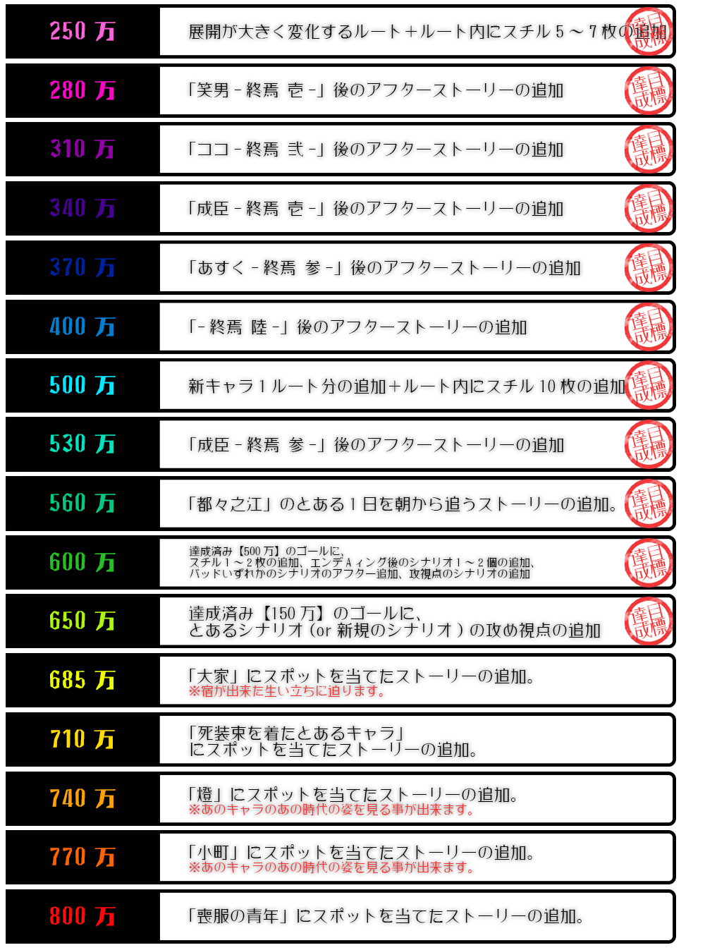 こんにちは。ゾンビリカです!いつも応援ありがとうございます!お陰様で着々とご支援頂き、とうとう560万達成させて頂きました!本当にありがとうございます!本編では出し切れなかった都々之江の1日を皆さまにお伝え出来るよう制作に励みますので、楽しみにして頂ければと思います♪さて、前回の活動報告で「ご意見お待ちしております」とお願いさせて頂き、結果、ストレッチゴールのみならず、既に出ているゴール・リターンの内容や物販に至るまで沢山のご意見・ご要望を頂く事が出来ました!大変嬉しく、大変関心し、大変参考になりました!特に希望が多かった・日天を皆が奪い合う・攻視点のストーリー・住人達でほのぼの/ギャグなストーリー・すごくえっちなやつ・既に達成したゴールの内容強化…等が多く見受けられましたので、殆どは、既に達成済みのゴールの中にて実装させて頂きたいと思っております♪勿論、他に頂いてるご意見も素敵なものばかりでしたので、全ては無理では御座いますが、なるべくご要望に添えるよう、形を変えつつ、要素としてなるべく達成済みのリターン、もしくは今後の展開の中で織り込ませて頂こうと思います。様々なご意見・ご要望、本当にありがとうございました!ご意見を元に、以下のストレッチゴールを追加致しました♪・600万:達成済み【500万】のゴールに、スチル1~2枚の追加+エンディング後のシナリオ1~2個の追加+バッドいずれかのシナリオのアフター追加+攻視点のシナリオの追加・650万:達成済み【150万】のゴールに、とあるシナリオ(or新規のシナリオ)の攻め視点の追加また、それに伴い以下のリターンを追加致しました♪・SS小冊子パート2(SS4編)※ネタバレとなるので詳しくは言えませんが、既に出ている「小冊子」とは違う方のエンディング後のお話となります。・ココのレシピ本※作中に出てくる、ココの作った食べ物全てを収録します♪ココの手書きのイラストやコメントも添えてあり、とても分かりやすいレシピ本になる予定です♪・オリジナルデザイン タペストリー※今回のCFで厘のミキ先生に描いて頂くイラストを、タペストリーにします! そして明日18年8月24日(金)の21時、数量限定で贄の町SDキャラ担当の麦飴アンプさんが手掛ける"オリジナルイラスト色紙 サイン付き" ・【2万枠】1キャラ(3名様限定)・【4万枠】2キャラ(2名様限定) を出させて頂きます。こちらはデジタルのみ、18禁要素指定不可となっております。※GはOKです♪以降、これ以上のリターンの追加は無い予定で御座います。これまで出させて頂いたリターンを含め、これらを出す決心をさせて頂き、本当にありがとうございました! そして、現段階で追加させて頂く心境としまして、「まだ1か月あるし、ここまで来たらジリジリいっとこう!」の気持ちで設定させて頂いております。ですので現時点でも十分嬉しく、十分に満足している事だけは!伝わってほしい!この気持ち!状態です。それでは、残りまだ1か月以上ございますので、ごゆるりと応援、ご参加よろしくお願いいたします(*^▽^*) 以上、ご報告申し上げます。どうぞ引き続き宜しくお願い申し上げます。