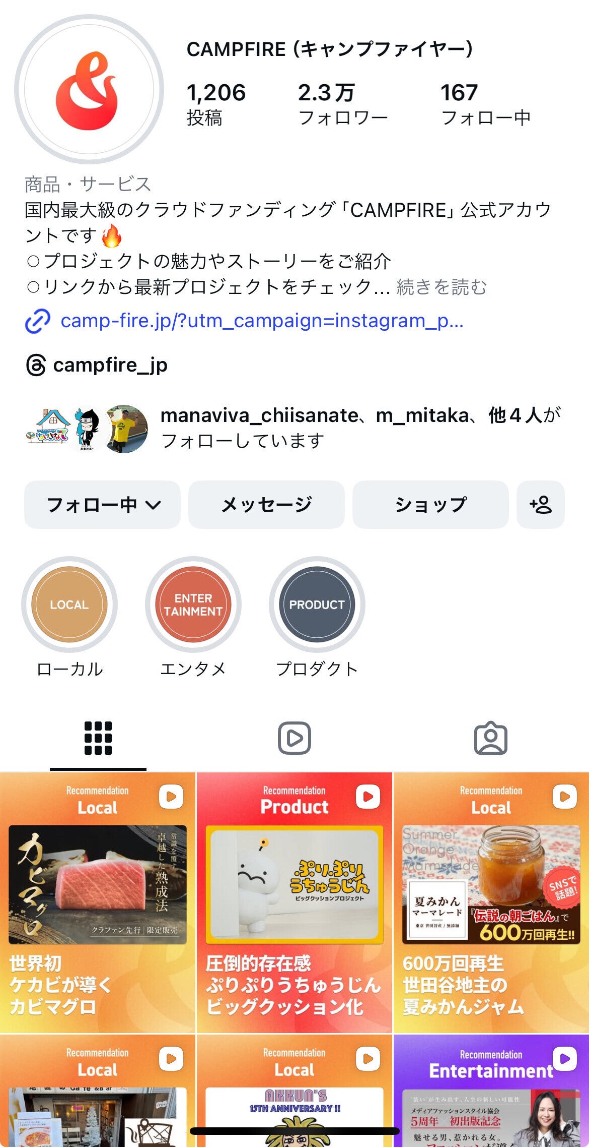 このクラウドファンディングCAMPFIREのInstagramアカウントから僕たちのInstagramをフォローいただきました!