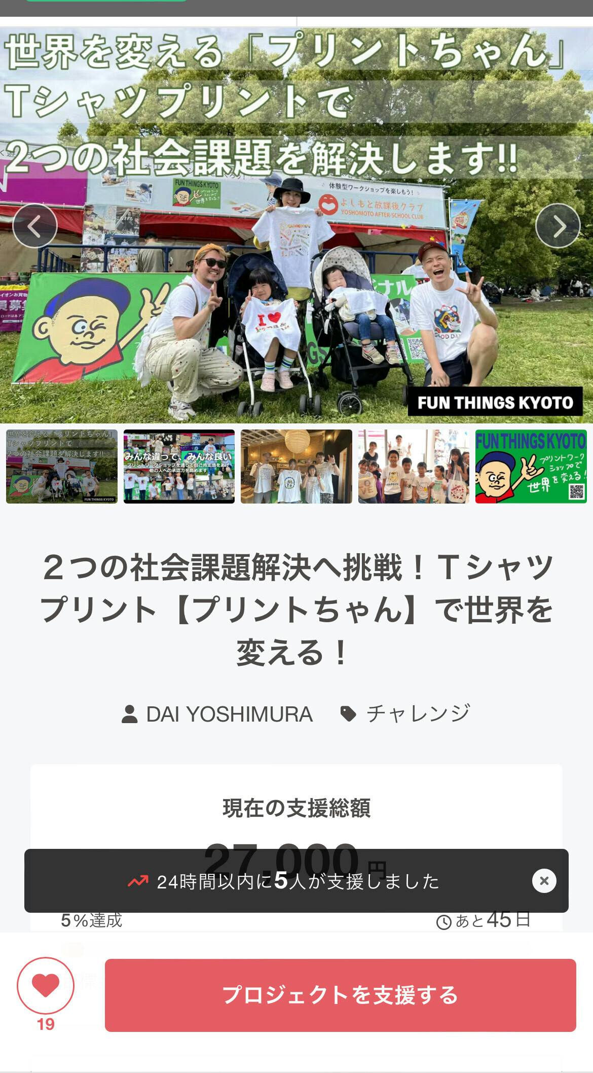 2025/12/17 21:47本日7時初めてのクラウドファンディング公開されました!実は数日前から1人ドキドキして緊張してましたが 公開すぐに初めての支援してくれる方もいらっしゃって泣きそうになりました1人1人の方が僕のページを読んで、想いを知り、支援という形へと行動してくださること言葉にならない感情で感動するんですね!本当にありがとうございます!今回のクラウドファンディングへの挑戦は、慣れてる方には小さな小さな一歩と思いますが私にとっては勇気を出した大きな一歩です!このスタートが未来を変える道の入り口と感じています!最後まで精一杯に取り組みますので引き続き応援よろしくお願いします!株式会社よしむらしるくすくりーん世界を変えるプリントワークショップFUN THINGS KYOTO代表取締役 吉村大 もっと見る