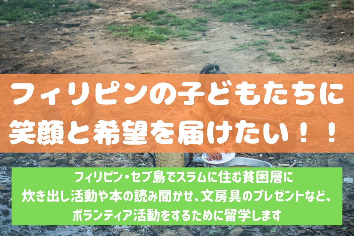 私は貧困をなくすためにできることを探すために、フィリピン・セブ島に6週間留学します。留学中はスラムや集落を訪れ、子どもたちとの交流を通して、貧困をなくすためにできることを探しに行きます。具体的な活動としては炊き出し活動、文房具などの提供、絵本の読み聞かせ、折り紙を教える、葉や花などを使ったアートを教えるなどです。折り紙やアートを教えたり、一緒にゲームをすることで、子どもたちに笑顔と希望を与えられると思います。将来的にはこのボランティア留学を通して、本当に必要とされている支援は何かを探し、それを実現したいと考えています。