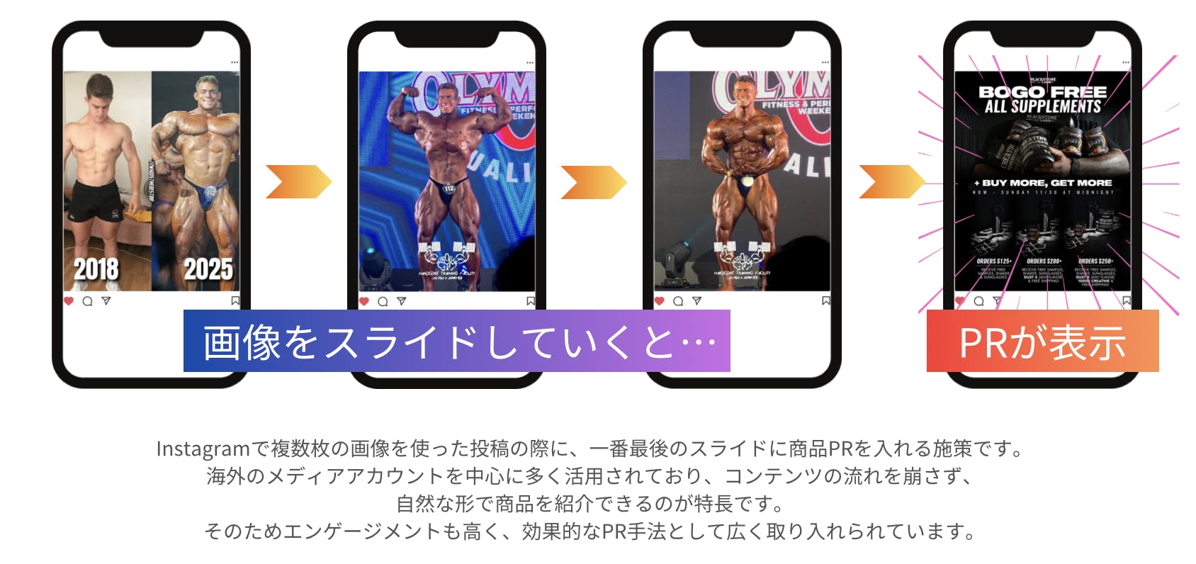紹介投稿は単発広告ではなく、「ストーリー性のある複数枚スライド投稿」の形式で行います。最後のスライドで自然にブランド・商品をご紹介し、“ただの宣伝”と感じられない設計で配信します。素材(商品画像・紹介映像など)は支援者様にご提供いただき、フィットネス文脈に沿った投稿を作成します。