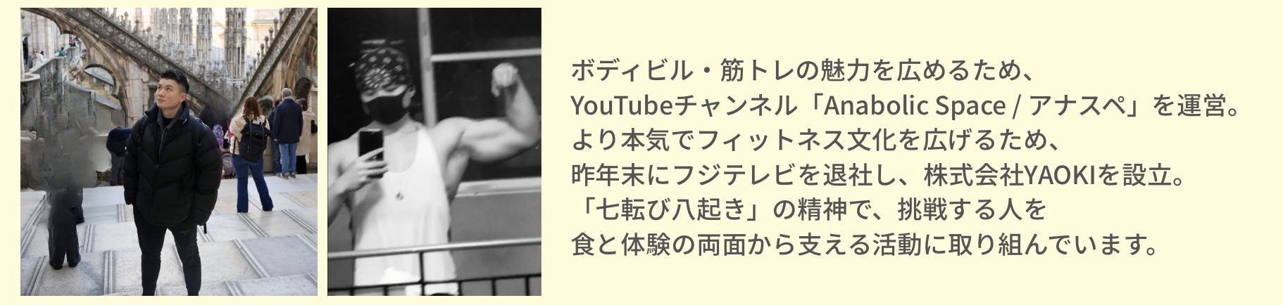 ボディビルや筋トレの素晴らしさを、もっと多くの人に伝えたいという想いから、2020年にフジテレビへ入社しました。テレビの現場で培った経験を活かしながら、約5年前からYouTubeチャンネル「アナボリックスペース(通称アナスペ)」を運営し、フィットネスやボディビルの魅力を発信し続けています。