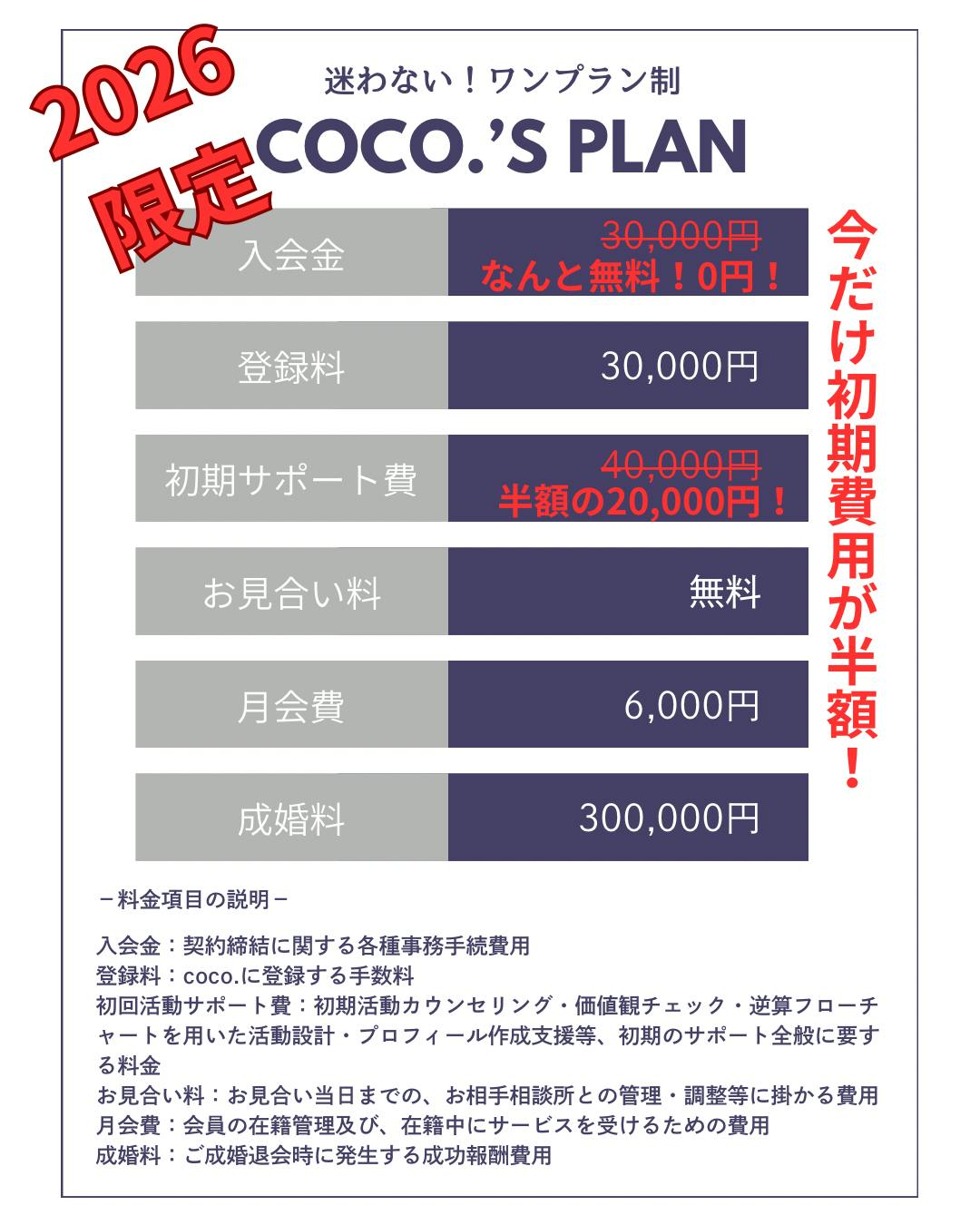 coco.では、複数のプランから迷う必要がない、わかりやすいワンプラン制を採用しています。それは、「婚活を、もっとカジュアルに。もっとわかりやすく。始めやすく。」というcoco.の理念につながっています。20〜30代限定の婚活サロンとして、初期費用を最小限に抑え、婚活をスタートしやすい料金設定にしています。