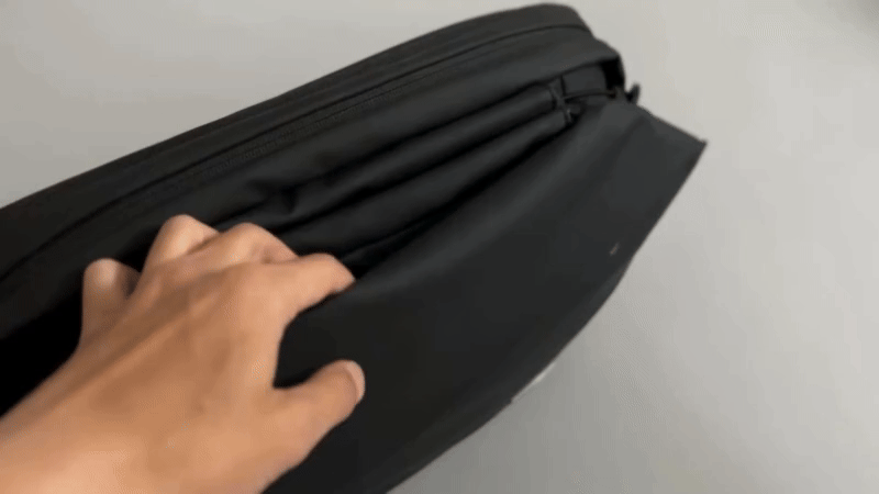 両端まで大きく開くダブルファスナーで、途中で引っ掛からずにスムーズに出し入れができるようになっています。